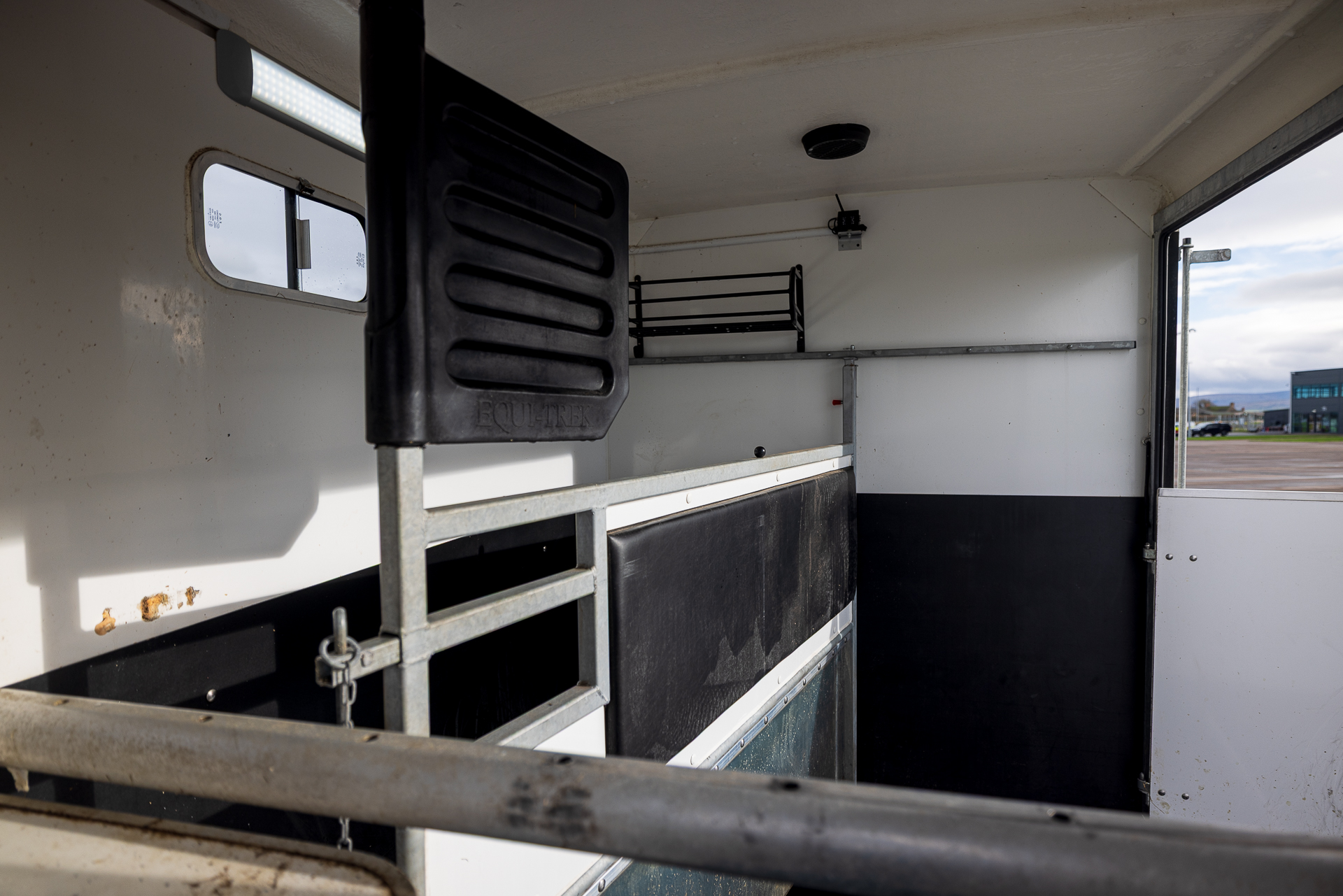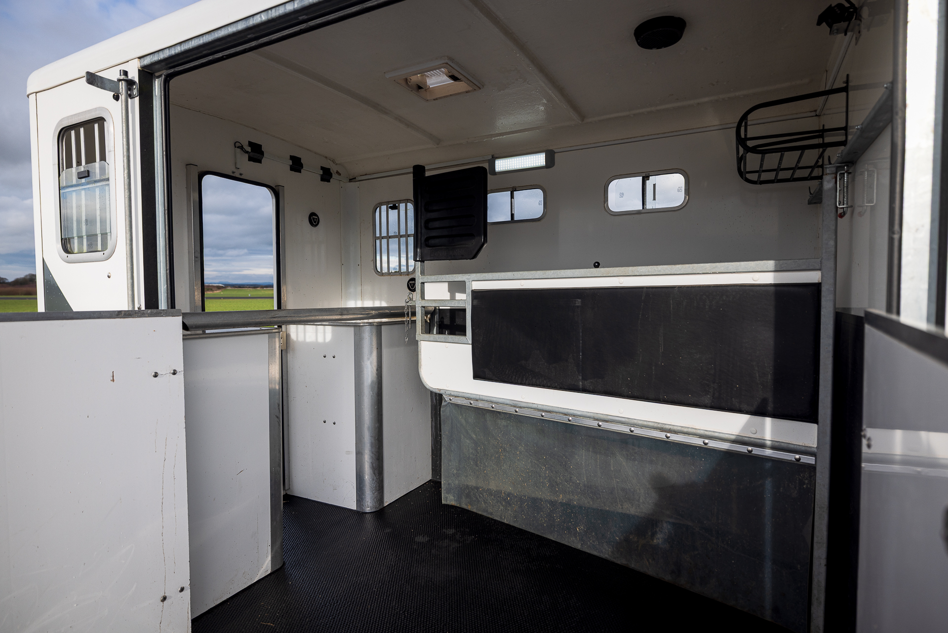 The well-appointed living area offers practical overnight facilities, including a dining layout, kitchen unit, fitted curtains, easy-clean cushion flooring, large front window, leisure battery and ample interior lighting. Further benefits include a large front locker, tack locker, grooms locker, saddle and bridle racks, external tie rings and easy access via the grooms door, making this a high-specification and thoughtfully designed trailer throughout.