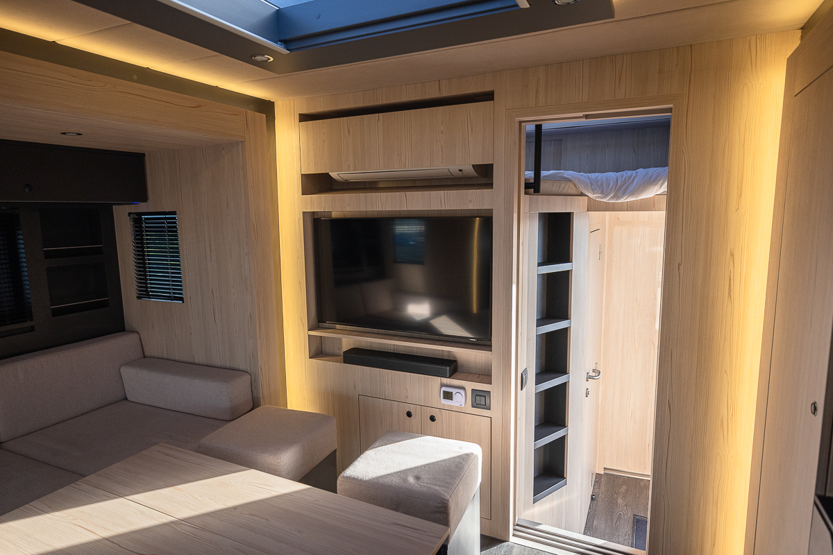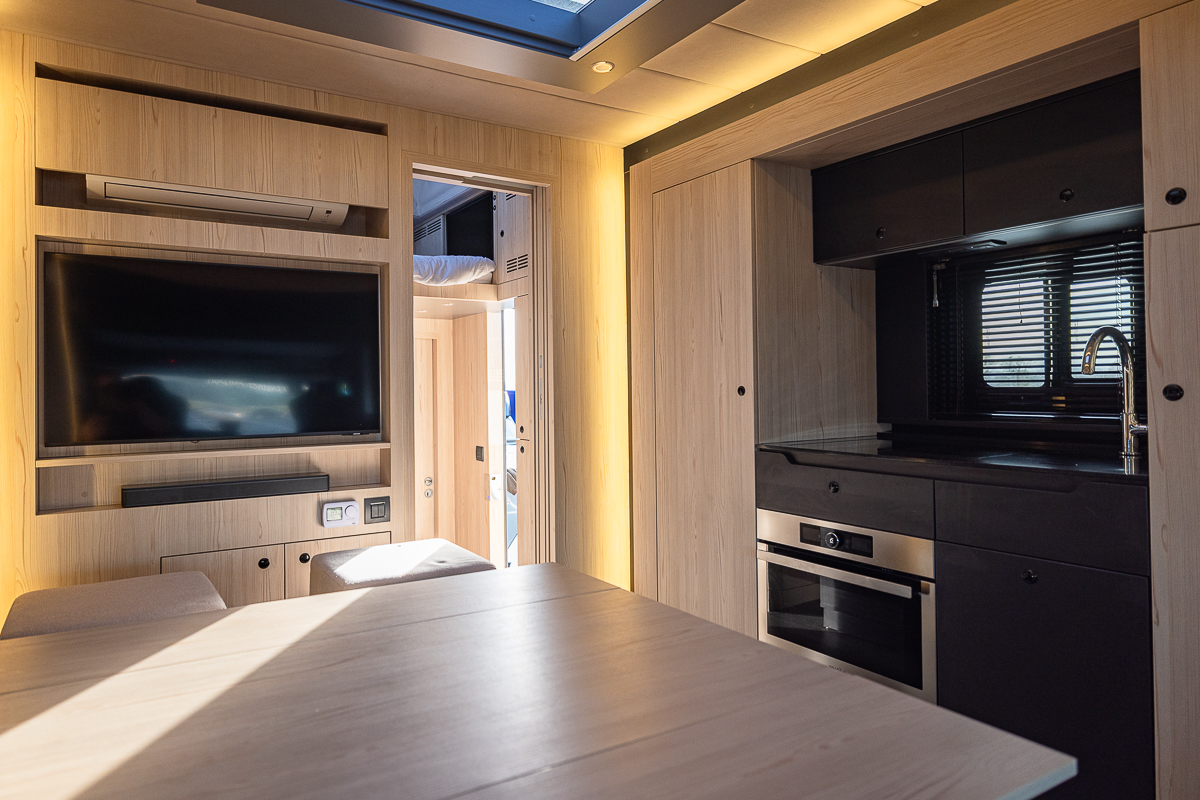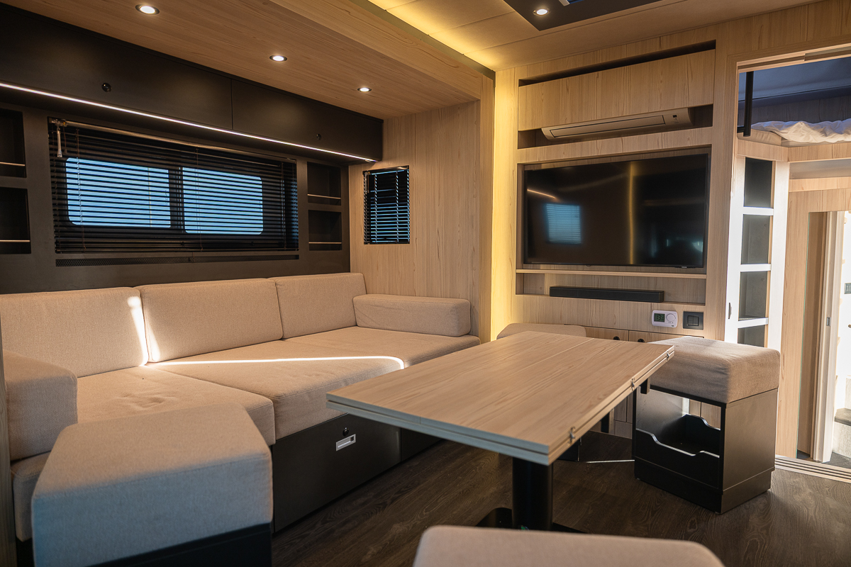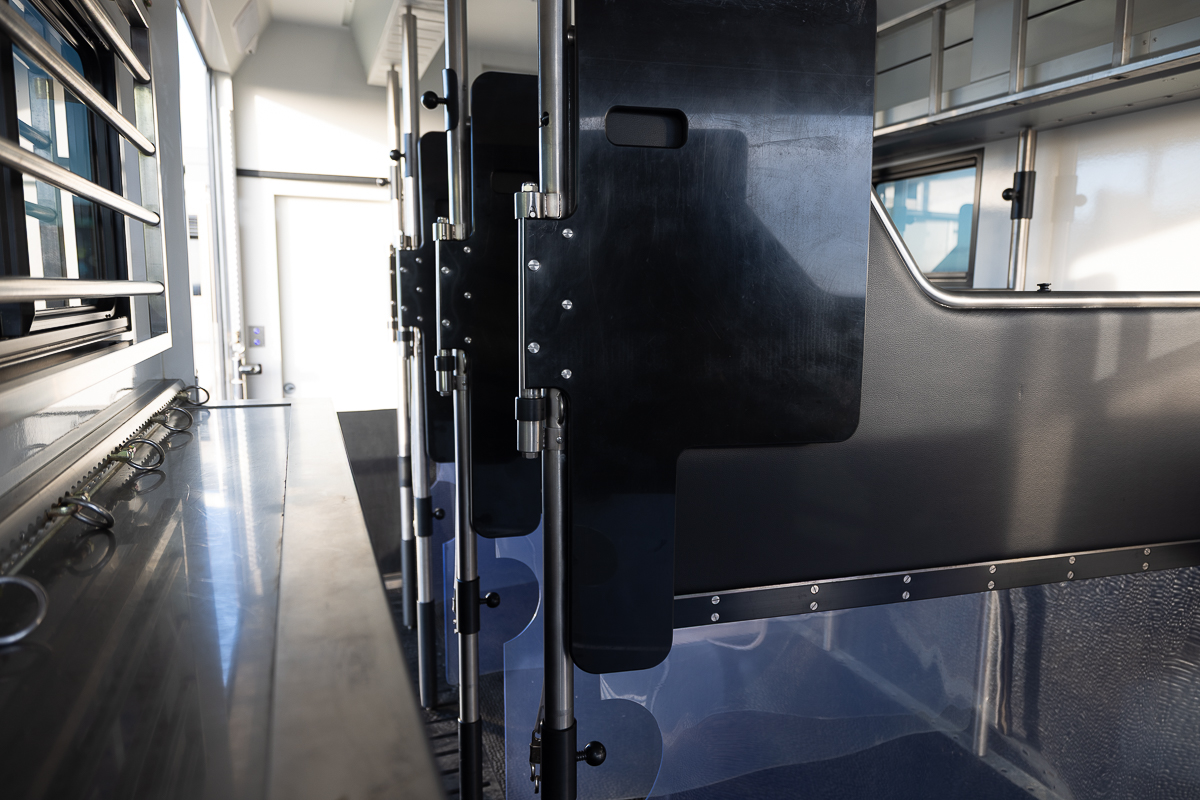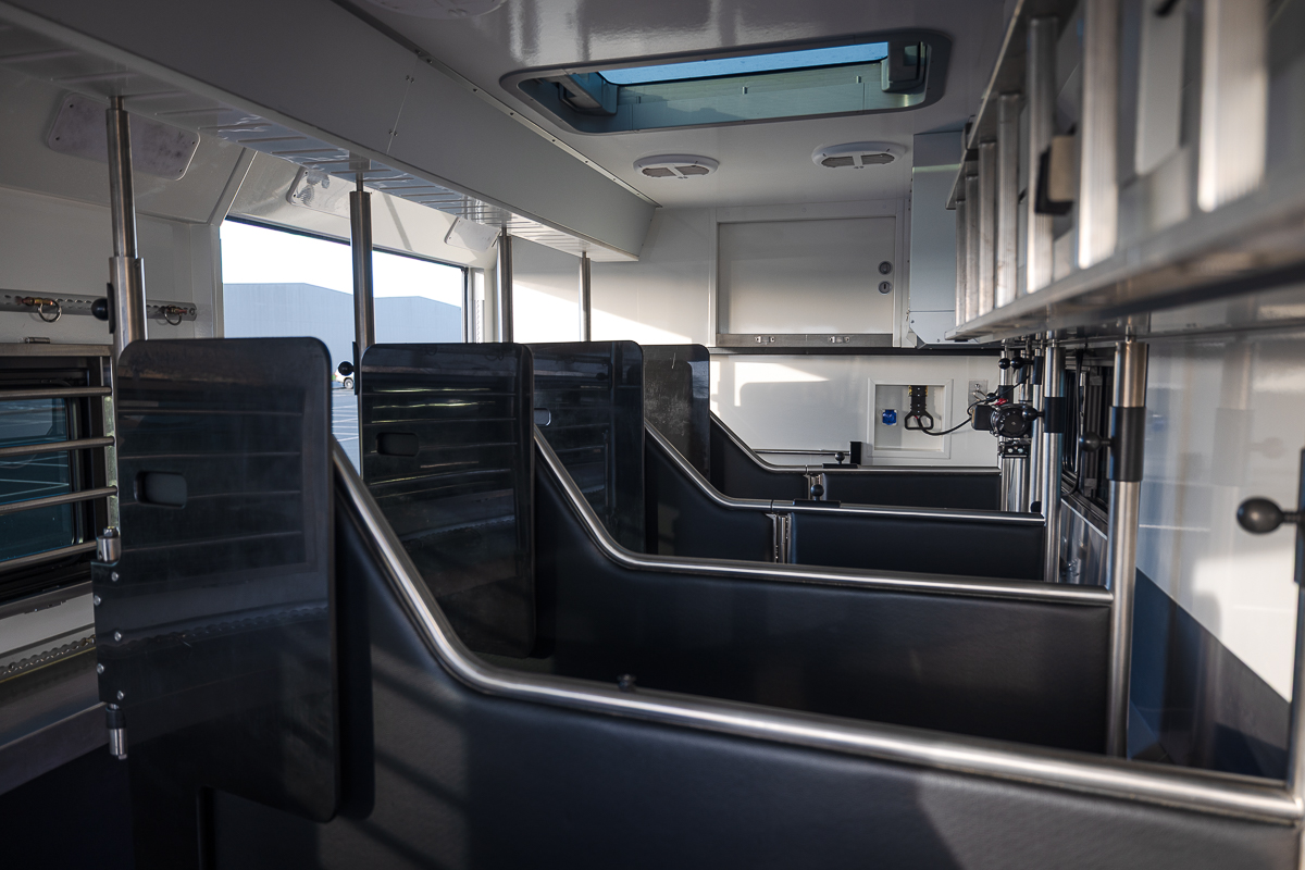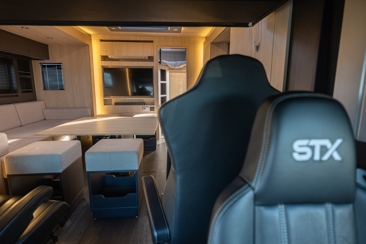 2 swivel seats, dual armrests finished in Black leather
