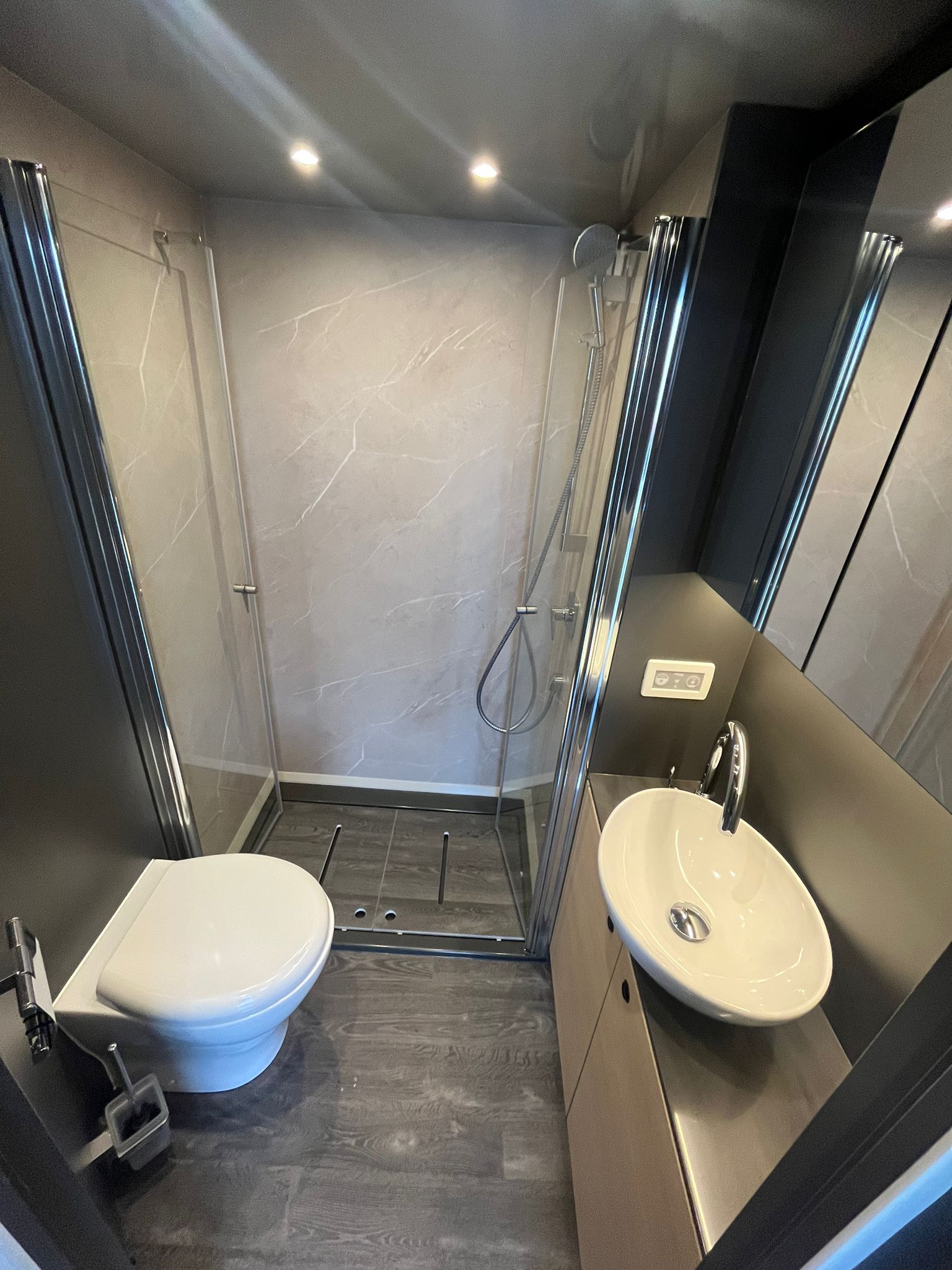 Completing the layout is a well-appointed bathroom with a shower featuring a thermostatic tap, sink, toilet, storage cupboard and electrical socket. Additional equipment includes a mobile tack locker, clean and waste water tanks, 220V and 24V power supply, outdoor lighting with motion sensor, frost-free water system and full air suspension. This exceptional horsebox combines performance, luxury and practicality in one outstanding package.