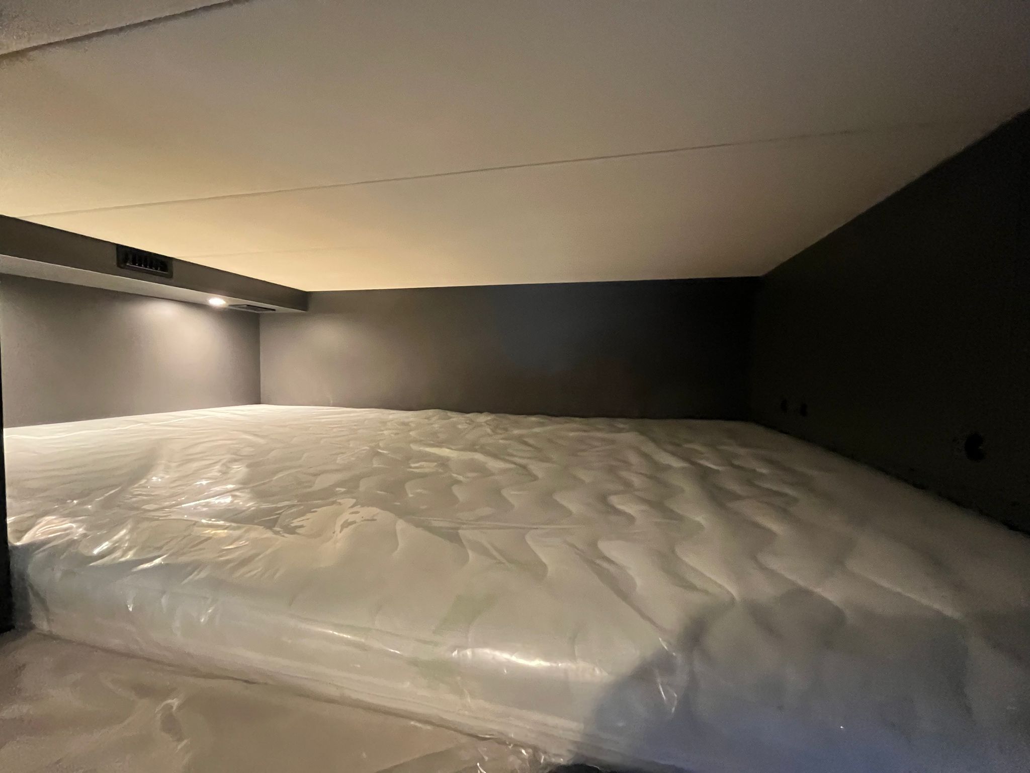 The luxurious pop-out living area offers generous space and a refined finish throughout. Upholstered walls and seating create a comfortable atmosphere, complemented by Apple TV, a flat-screen television and an integrated audio system. Climate control is ensured with split air-conditioning and heating systems, while the fully equipped kitchen includes a ceramic cooking hob, microwave oven and refrigerator, providing true home-from-home comfort for extended stays.