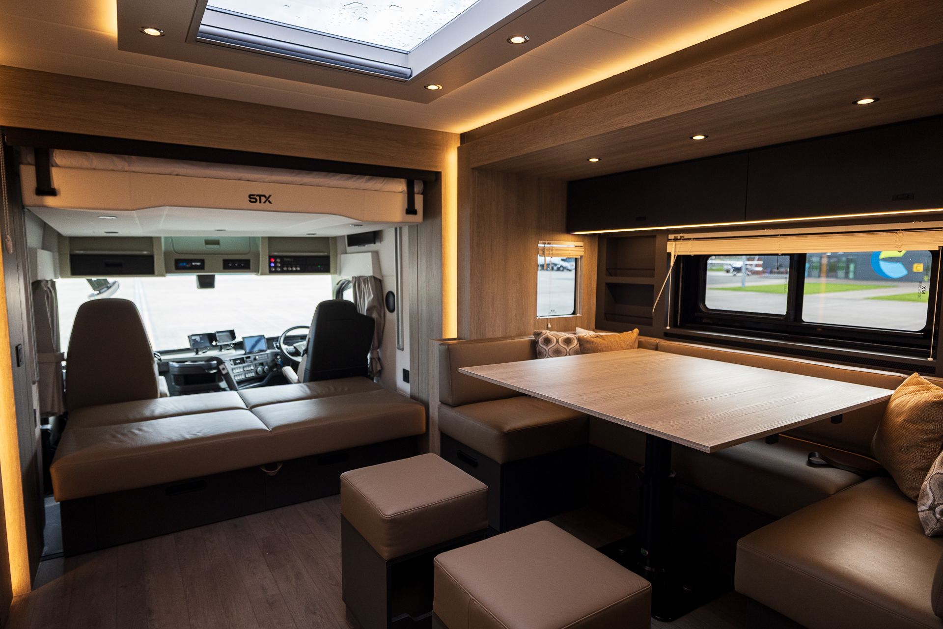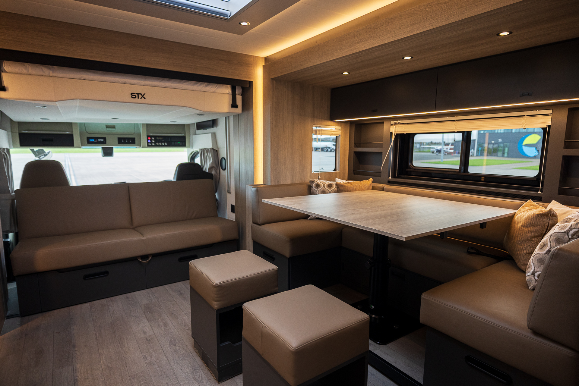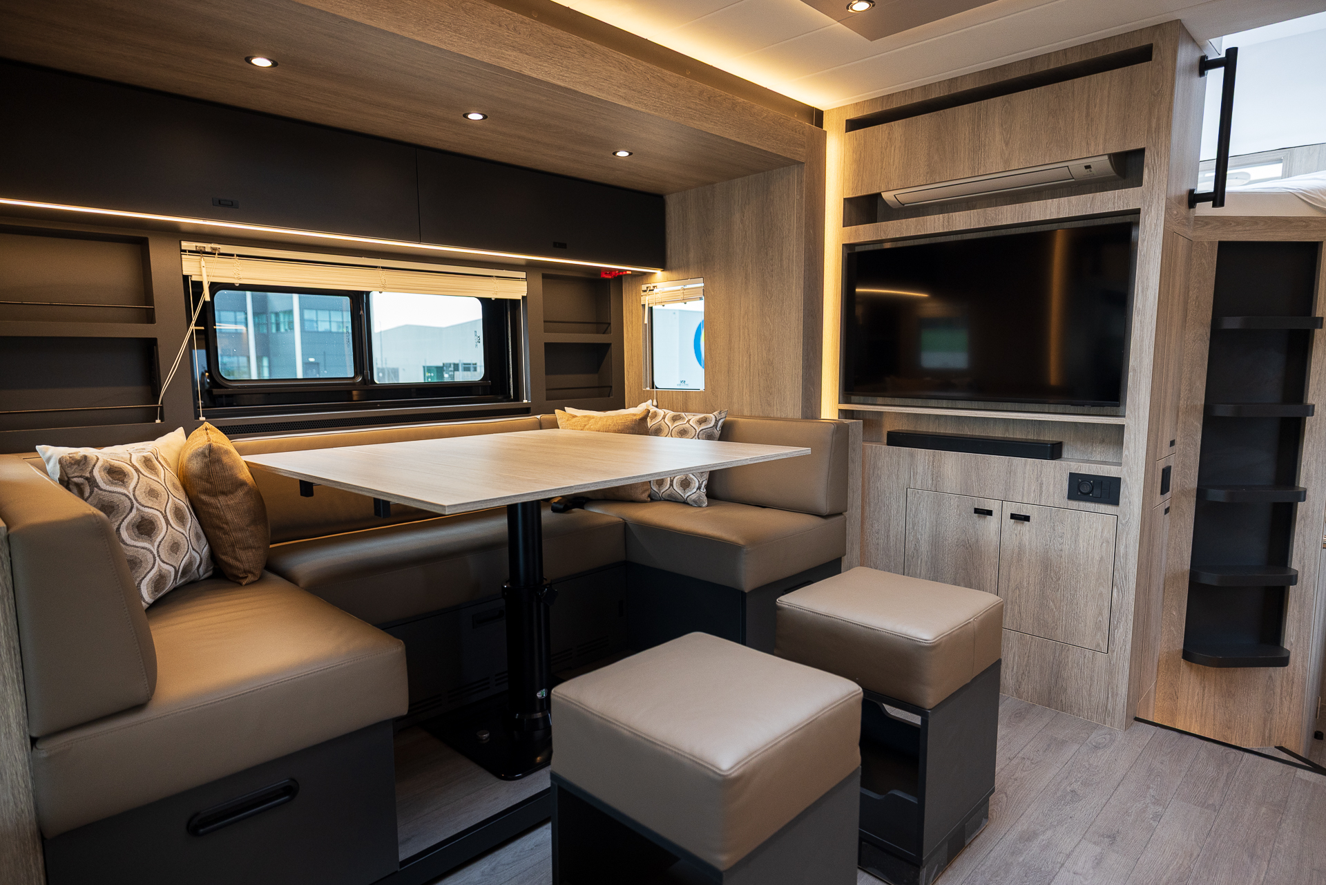 The living accommodation is expansive and luxuriously appointed, benefitting significantly from the dual pop-outs. Upholstered walls and premium leather seating create a refined interior atmosphere, complemented by two televisions, Apple TV, and an exclusive audio system. Climate control is provided by split air-conditioning and heating systems, further enhanced by upgraded boilers and a Kabola KB40 heating system to ensure reliable comfort in all seasons. The fully equipped kitchenette includes a microwave oven, ceramic cooking top, and refrigerator, while the latest USB charging sockets are installed throughout the living area and sleeping quarters for modern convenience.