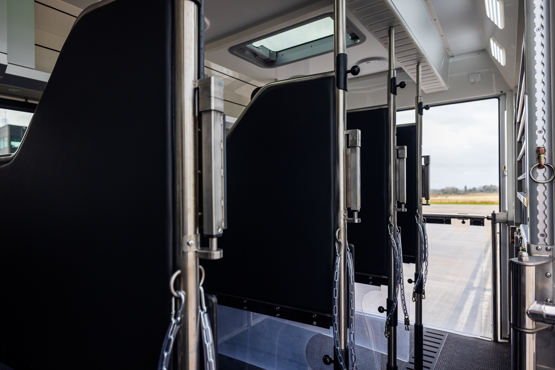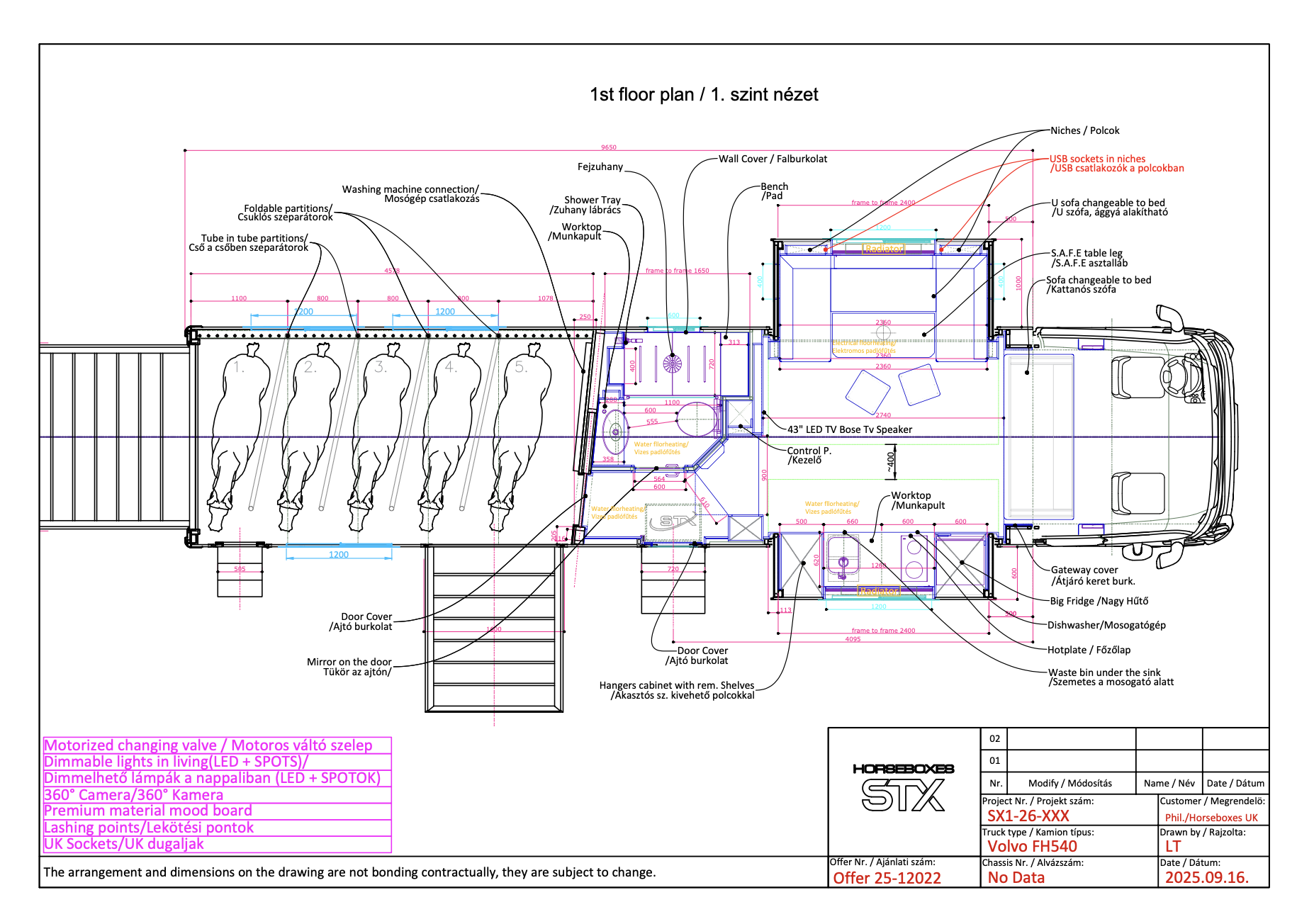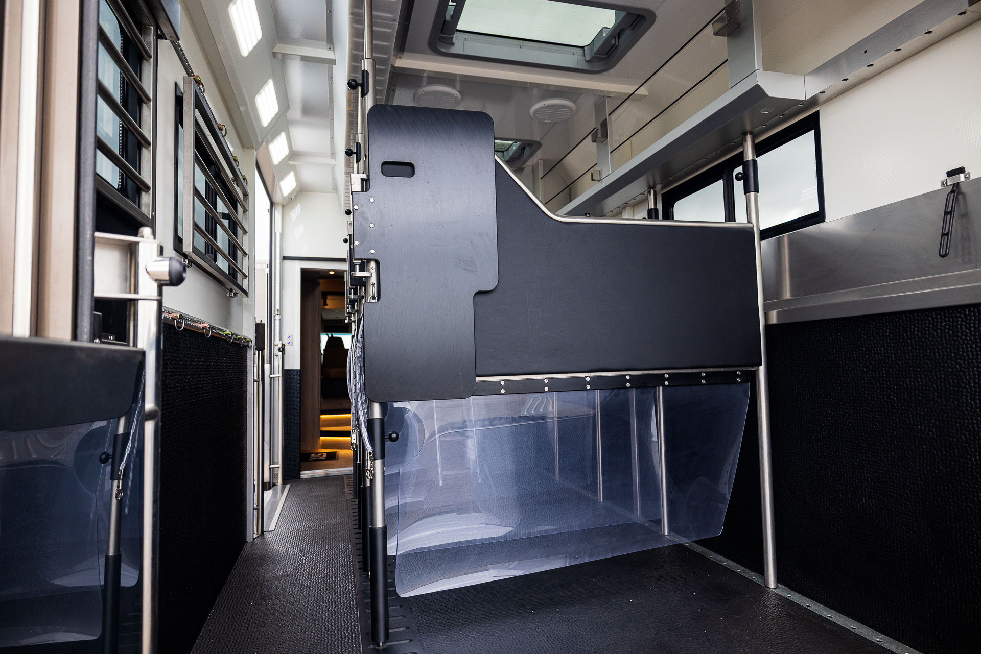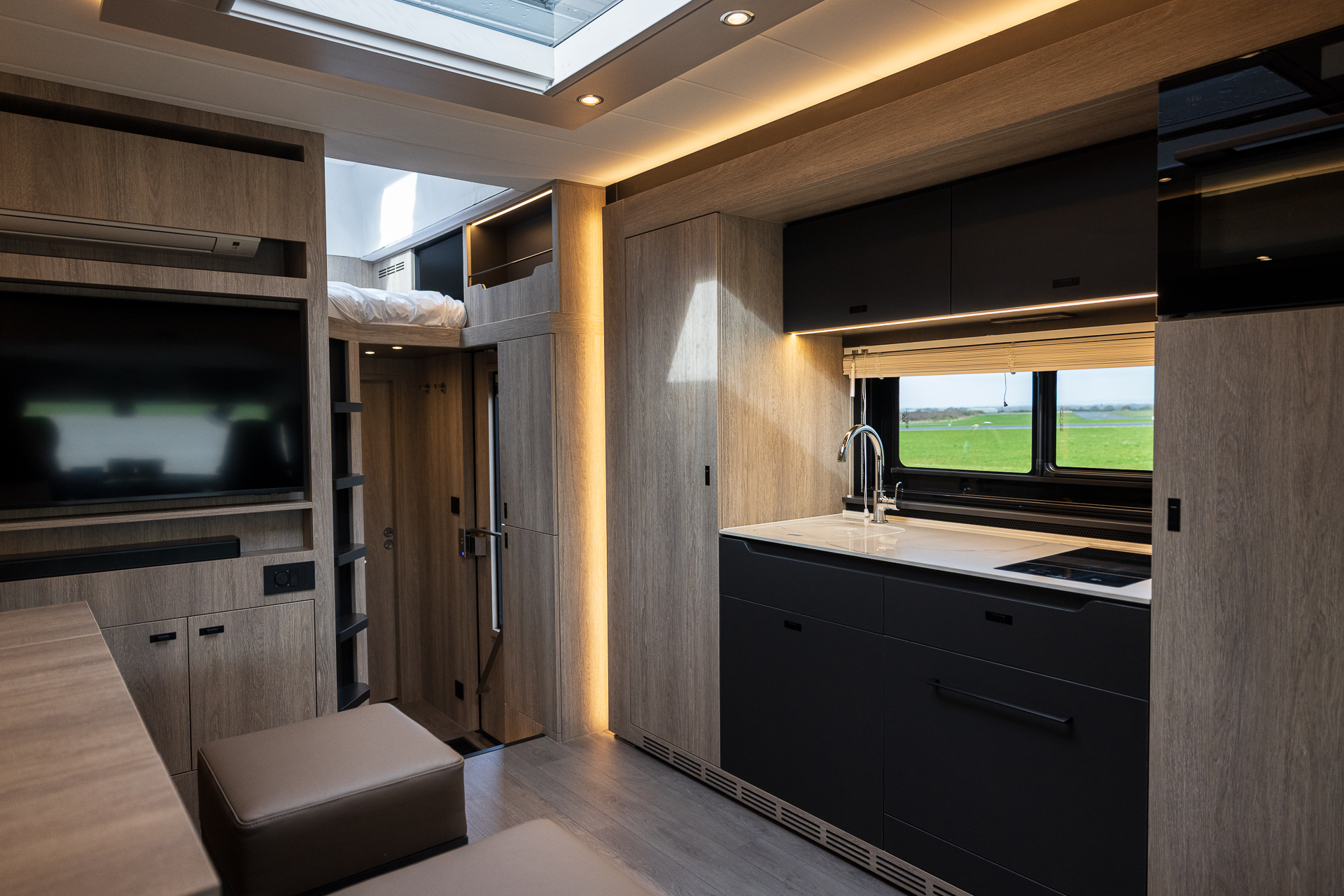The horse area has been designed with a clear focus on safety, ventilation, and ease of operation. It features durable rubber flooring, skylights, cooling fans, and temperature registration to maintain a stable and comfortable environment during travel. Adjustable partitions allow flexibility for different horses, while a surveillance camera system enables continuous monitoring in transit. Side and rear loading ramps provide safe and efficient access, supported by practical storage solutions including a blanket rack and saddle cupboard. A large external tack box with lift, along with an integrated water tank and hose system, ensures excellent functionality both on the road and at events.