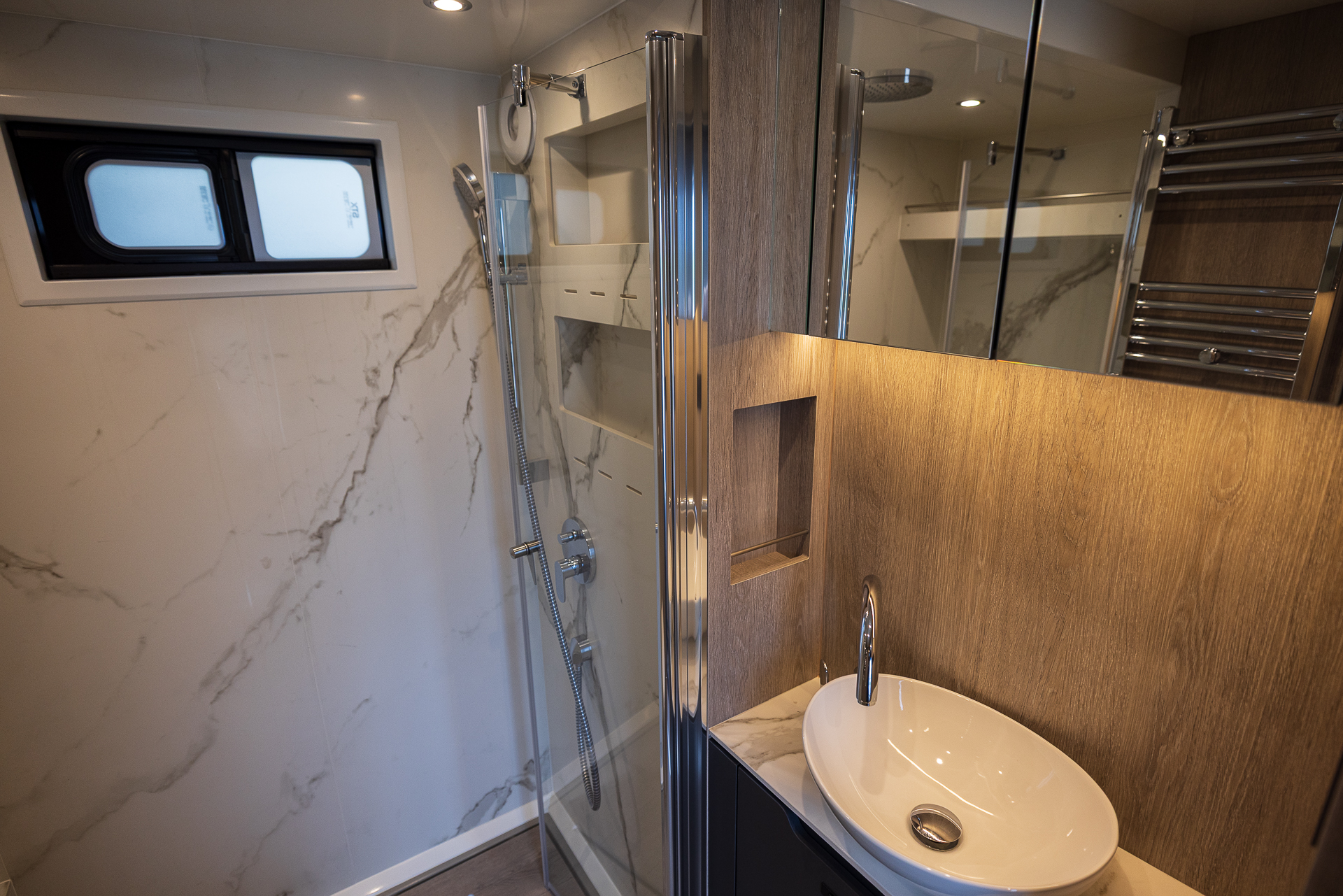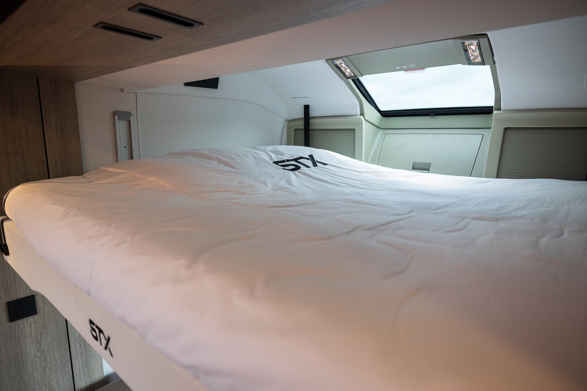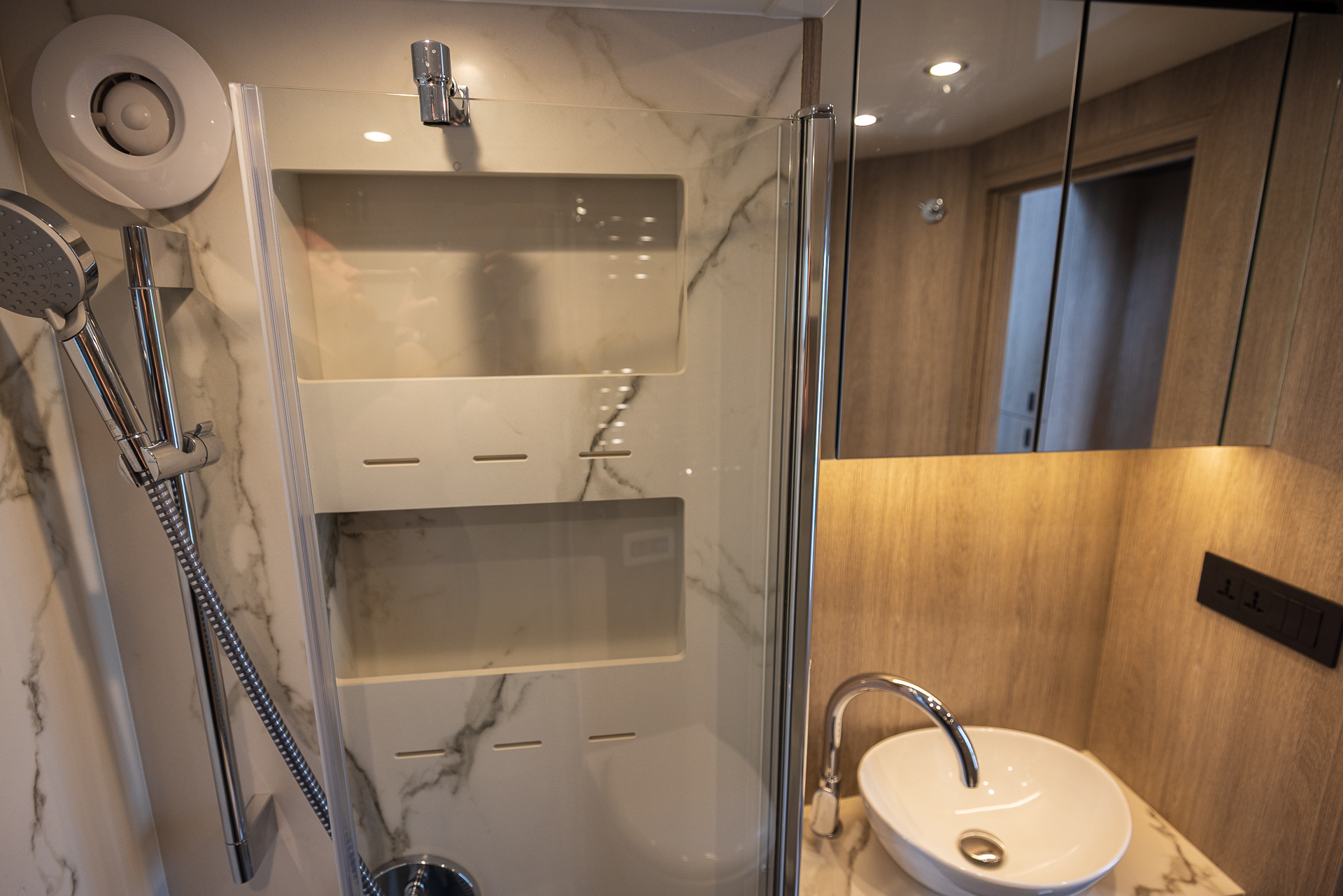 Sleeping arrangements include a dedicated groom’s bedroom positioned above the bathroom, with direct access into the living area, providing privacy without compromising flow. The large bathroom delivers hotel-level practicality, featuring a shower with thermostatic tap, sink with cupboard storage, electrical socket, towel dryer, and toilet. Supporting systems include clean and waste water tanks, 220-volt and 24-volt power supply, a 5 kW generator, exterior lighting with motion sensor, a frost-free water system, 360-degree camera coverage for enhanced manoeuvrability, and aluminium rims that complete the vehicle’s premium specification.
