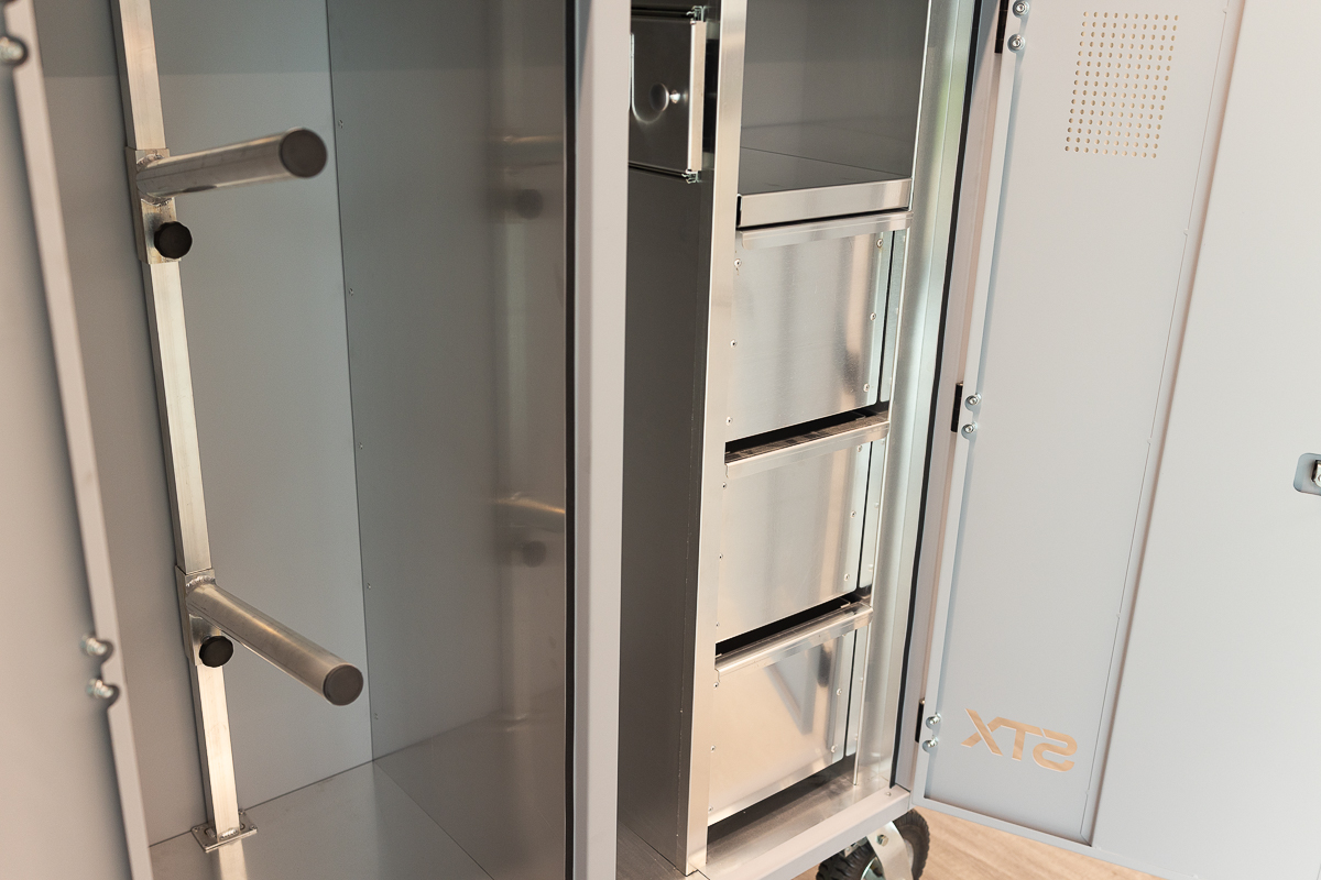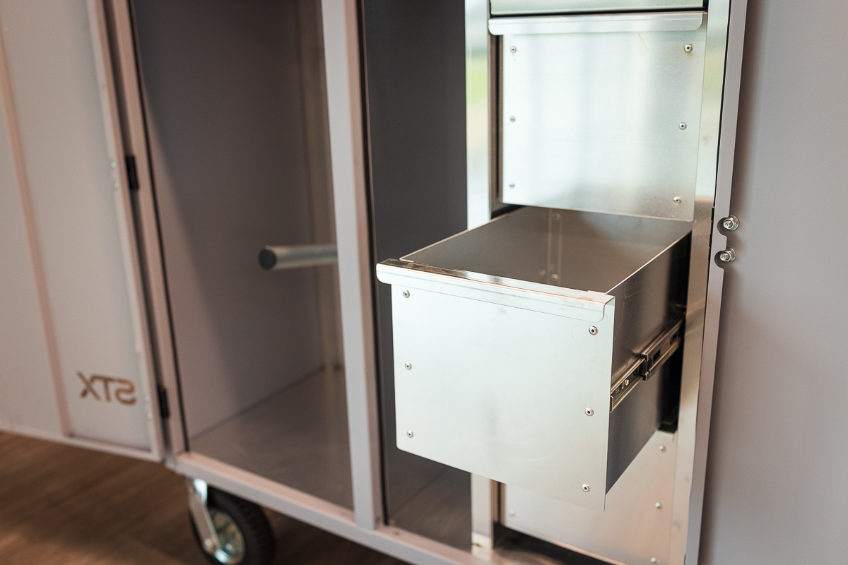 The expanded interior provides enhanced organization, featuring multiple removable drawers for grooming tools and accessories, along with open vertical storage designed to accommodate larger tack and equipment. Lockable double doors help keep contents secure, while smooth-rolling casters allow for easy transport and repositioning as needed.