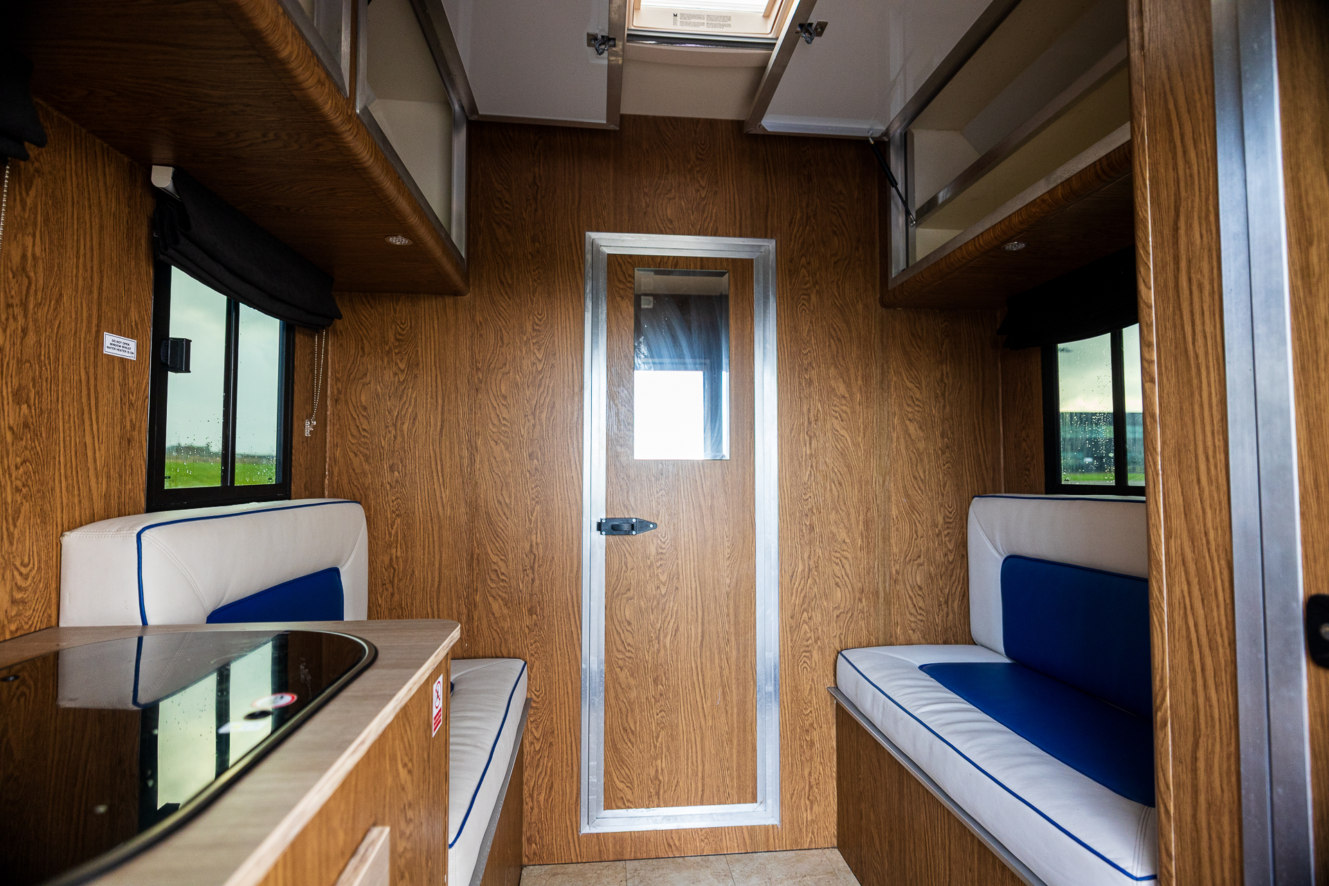The living quarters are bright, modern, and fully equipped, offering comfortable 2-berth accommodation. The layout includes a functional kitchen with gas hob, fridge, sink with hot and cold water, and mains sockets, making it perfectly suited for overnight stays or competition weekends. Dining converts effortlessly into a double bed, and ample storage is provided throughout. Additional features such as bonded windows, 240v hook-up, solar charging, air conditioning, and cruise control enhance comfort and usability.