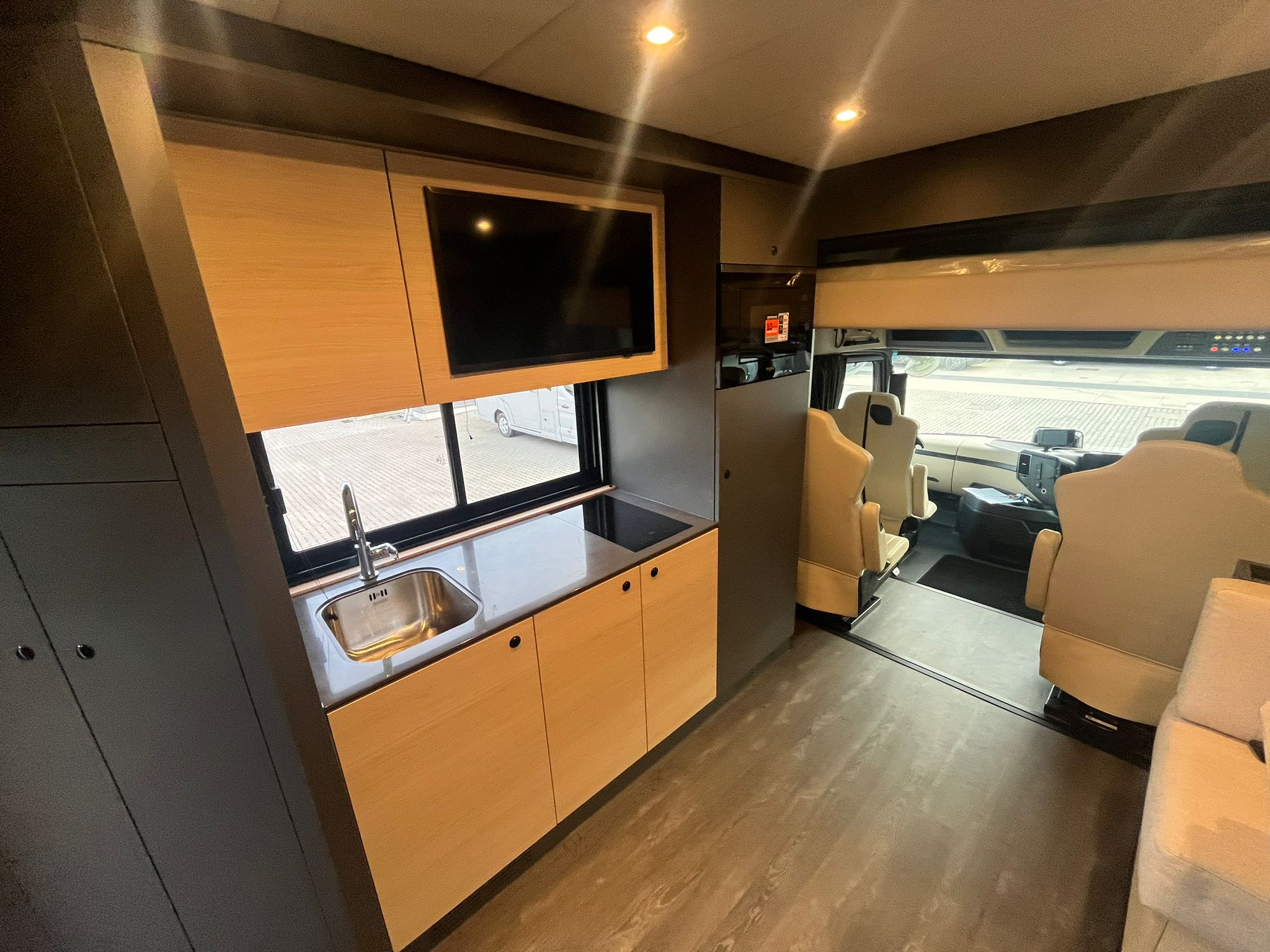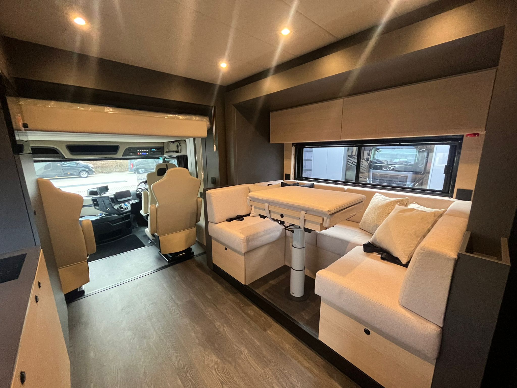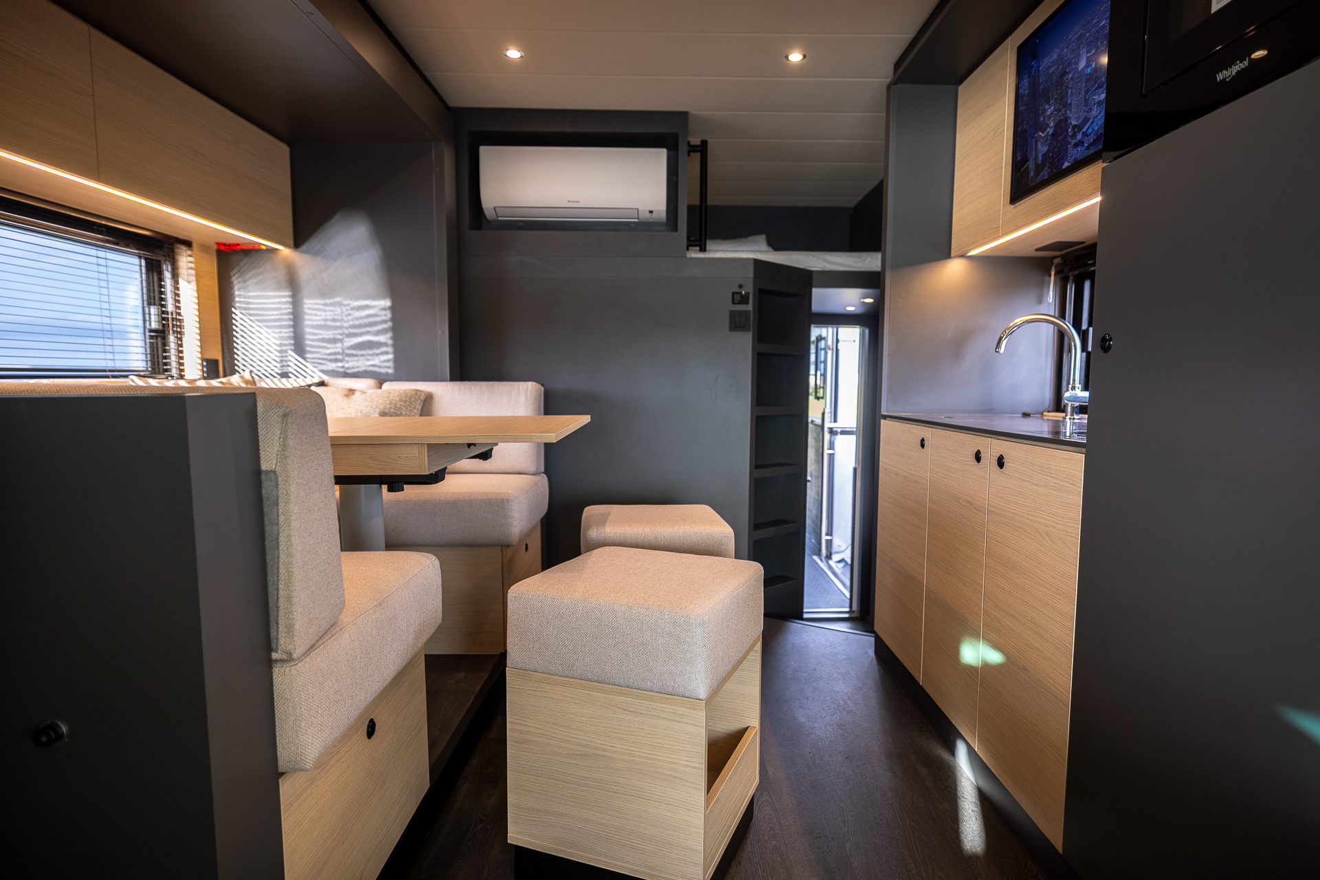 The luxurious pop-out living area offers generous space and a refined finish throughout. Upholstered walls and seating create a comfortable atmosphere, complemented by Apple TV, a flat-screen television and an integrated audio system. Climate control is ensured with split air-conditioning and heating systems, while the fully equipped kitchen includes a ceramic cooking hob, microwave oven and refrigerator, providing true home-from-home comfort for extended stays.