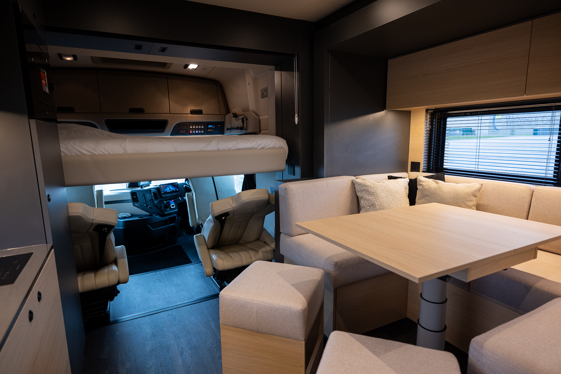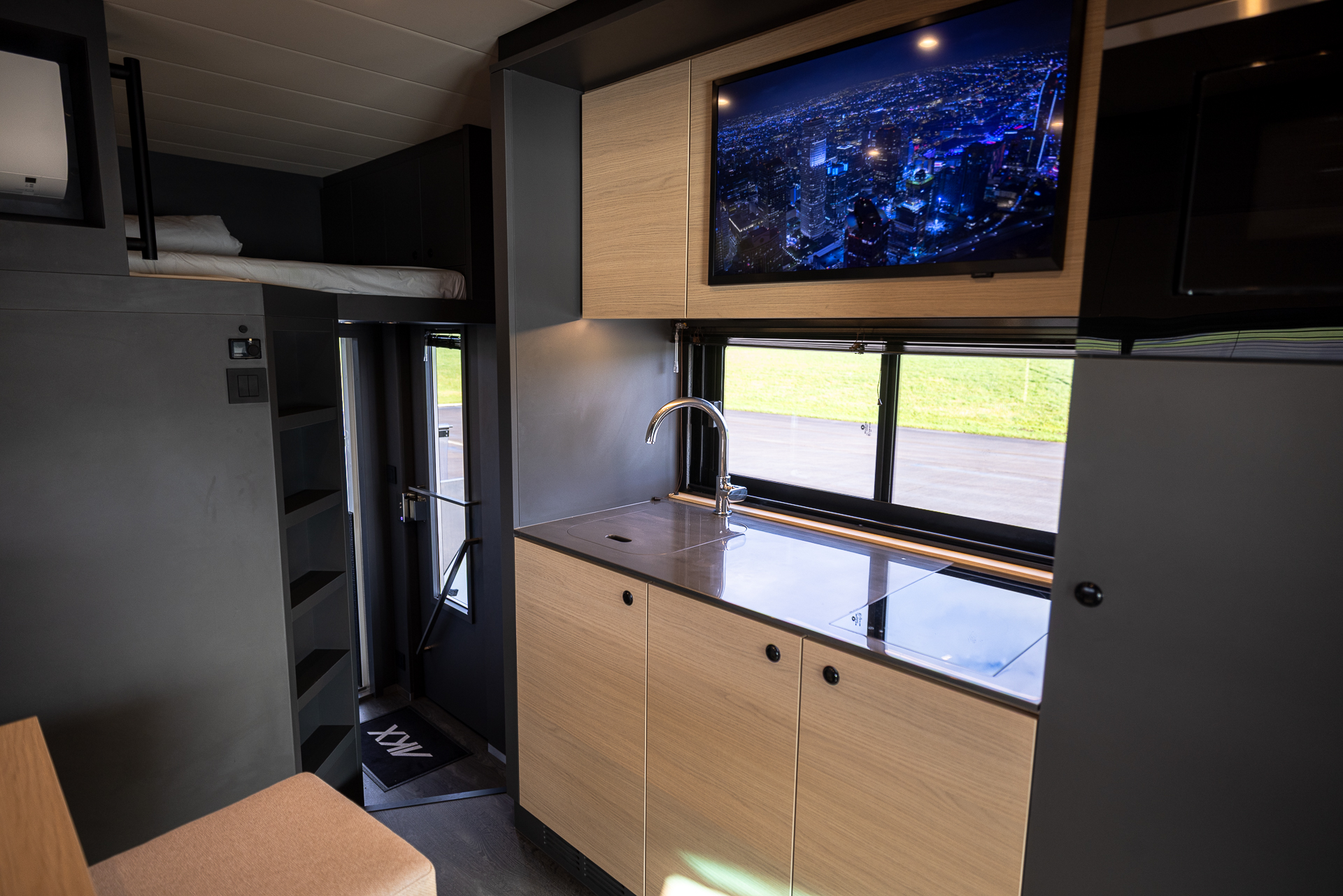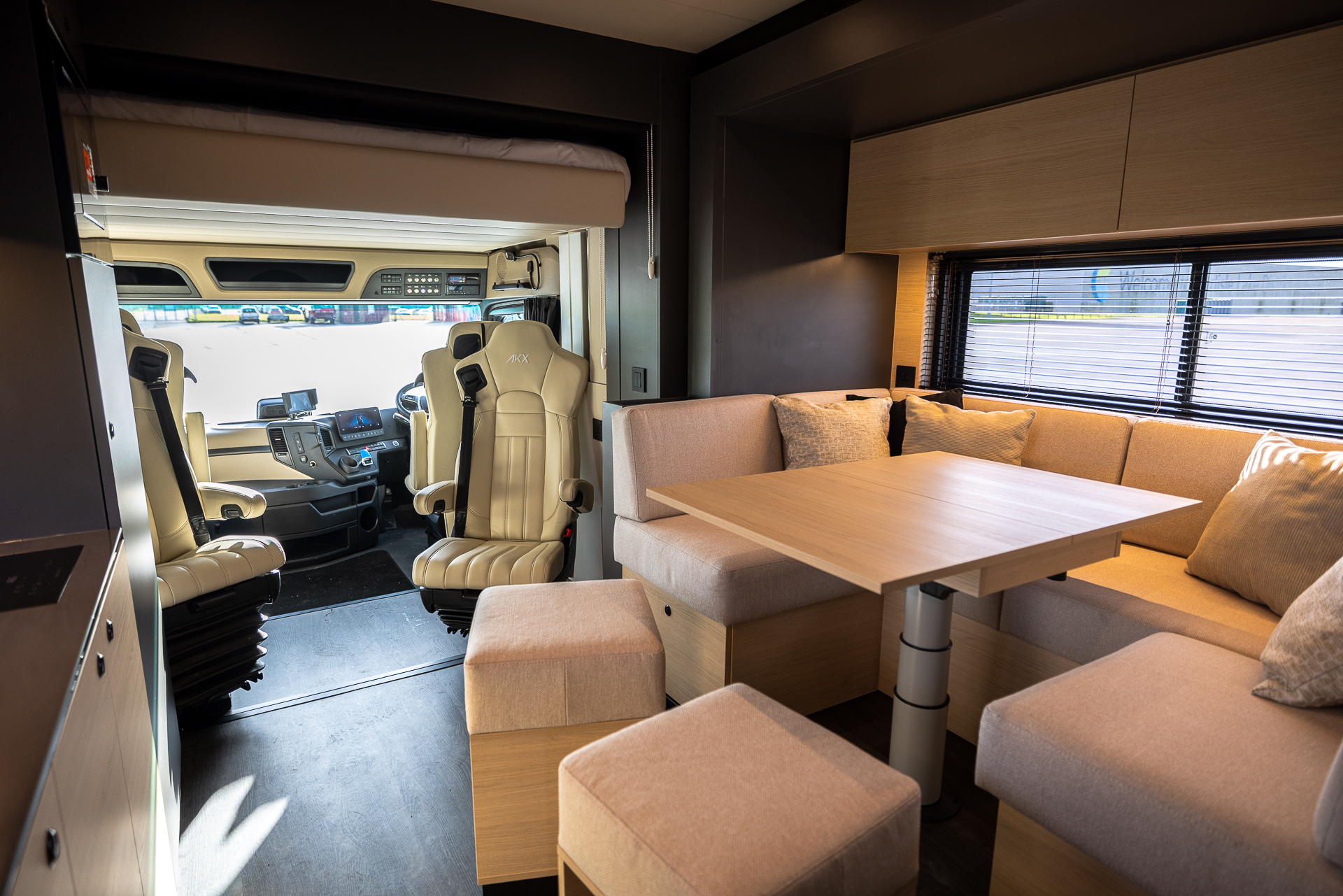 The luxurious pop-out living area offers generous space and a refined finish throughout. Upholstered walls and seating create a comfortable atmosphere, complemented by Apple TV, a flat-screen television and an integrated audio system. Climate control is ensured with split air-conditioning and heating systems, while the fully equipped kitchen includes a ceramic cooking hob, microwave oven and refrigerator, providing true home-from-home comfort for extended stays.