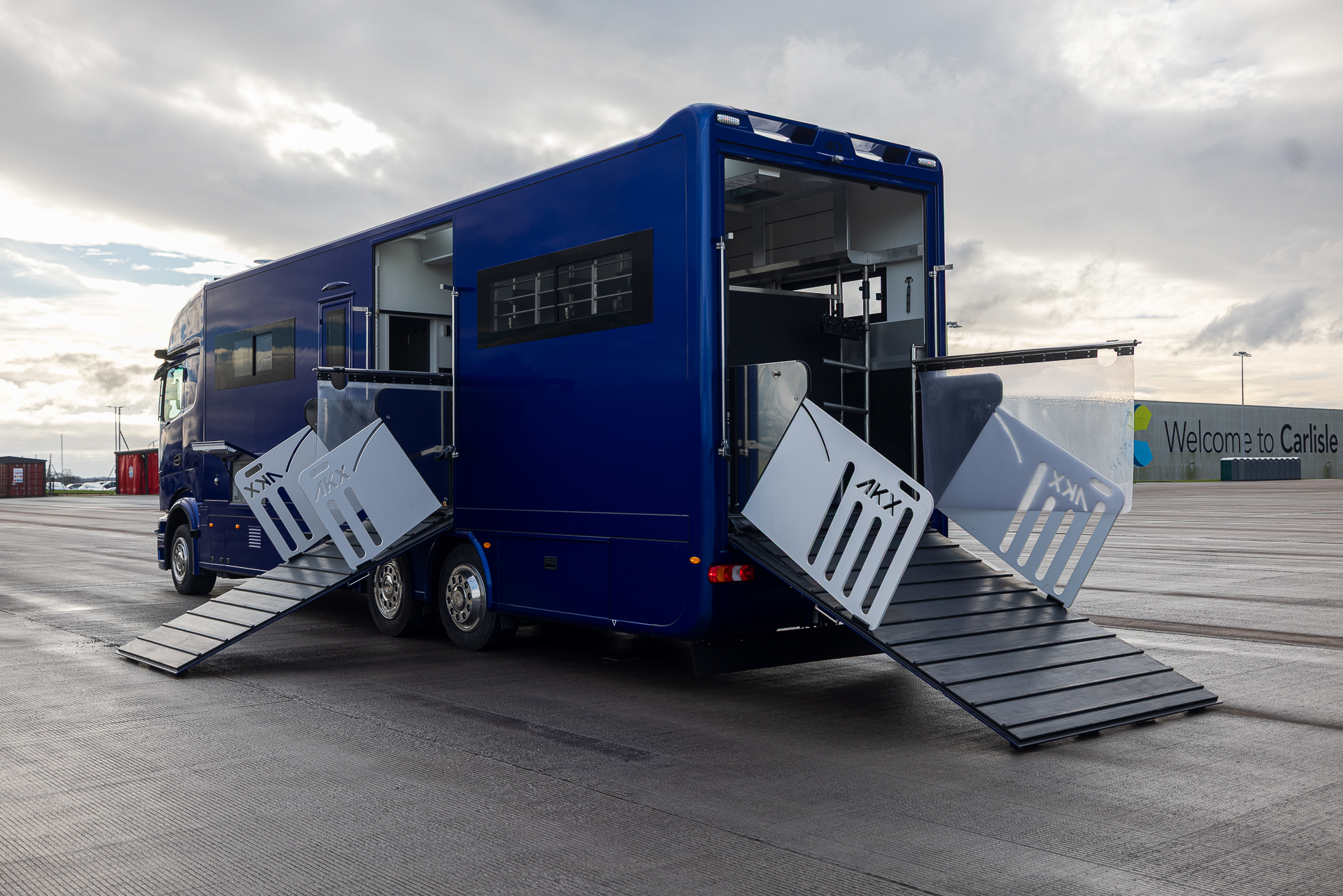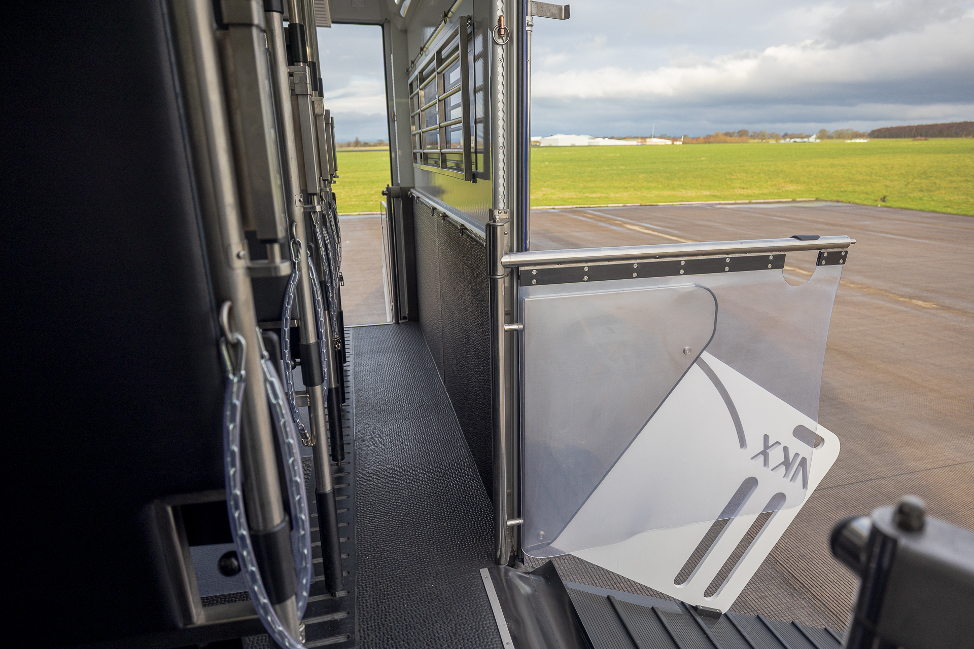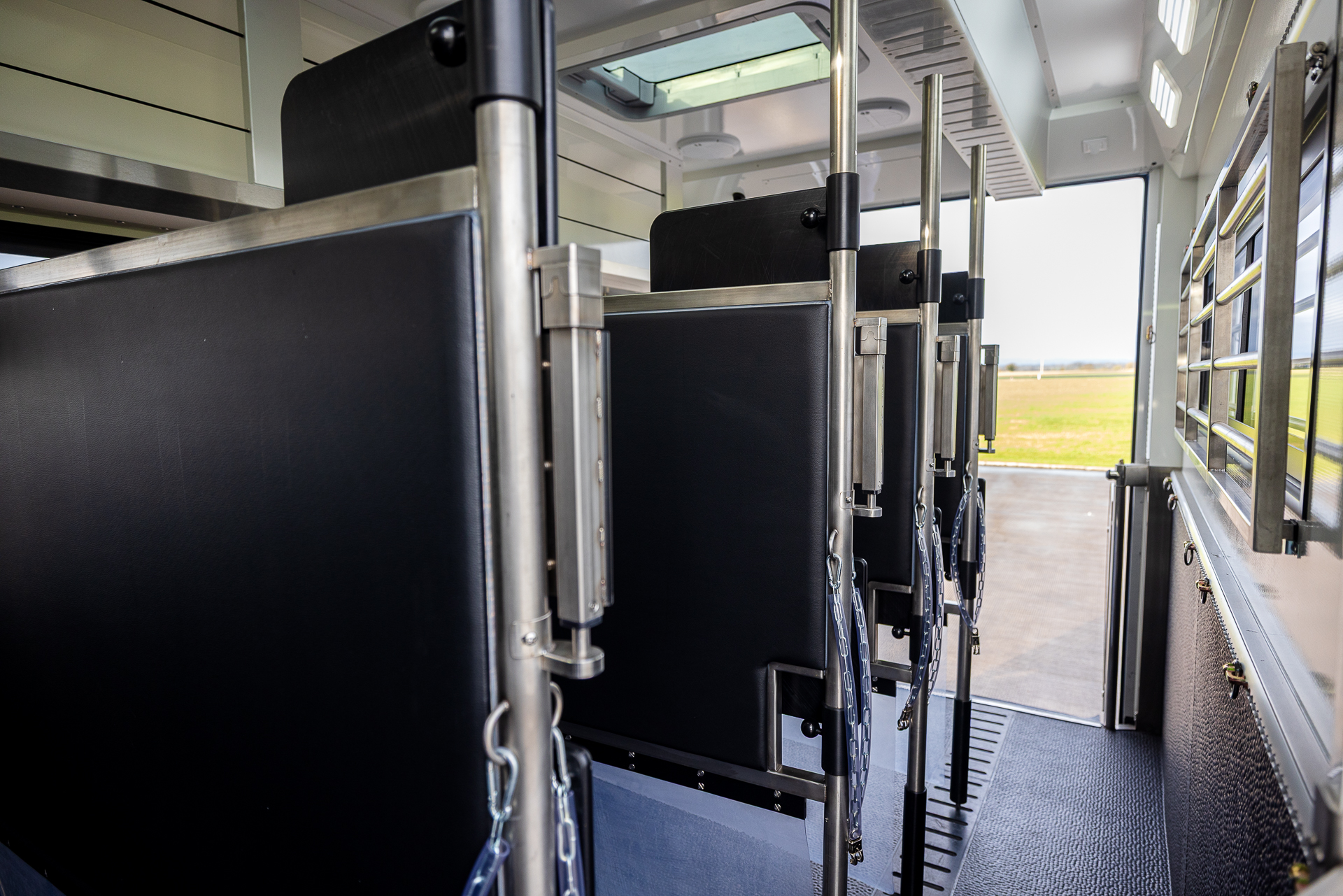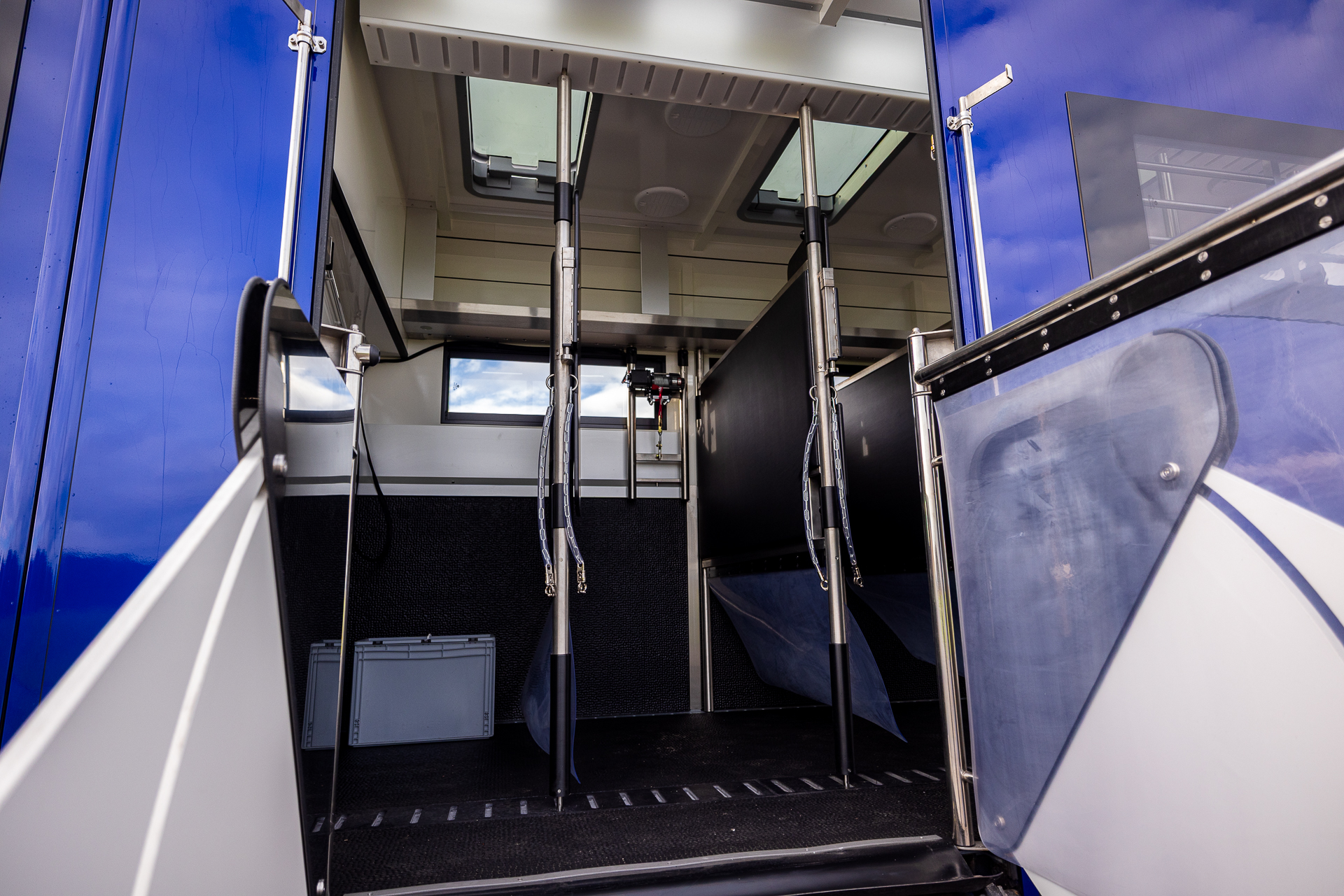 The horse area has been thoughtfully designed with horse welfare as a priority. It features high-quality rubber flooring, skylights for natural light, temperature monitoring, cooling fans and an integrated surveillance camera. Adjustable partitions allow for flexible stabling, while both side and rear loading ramps ensure easy access. Additional practical storage includes a blanket rack, saddle cupboard and onboard water tank, creating a calm, safe and functional environment for travel.