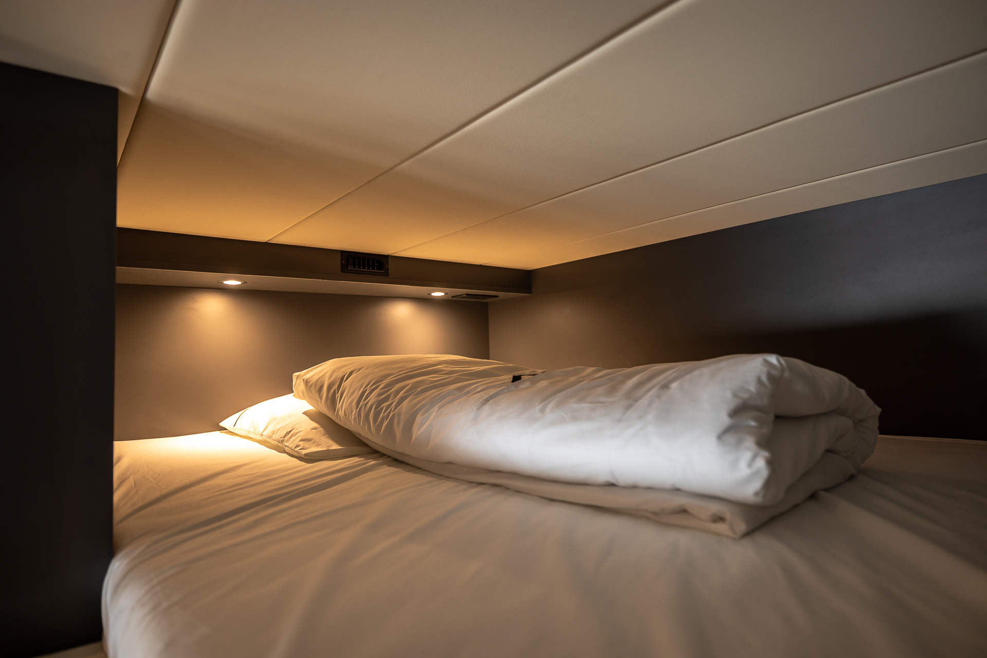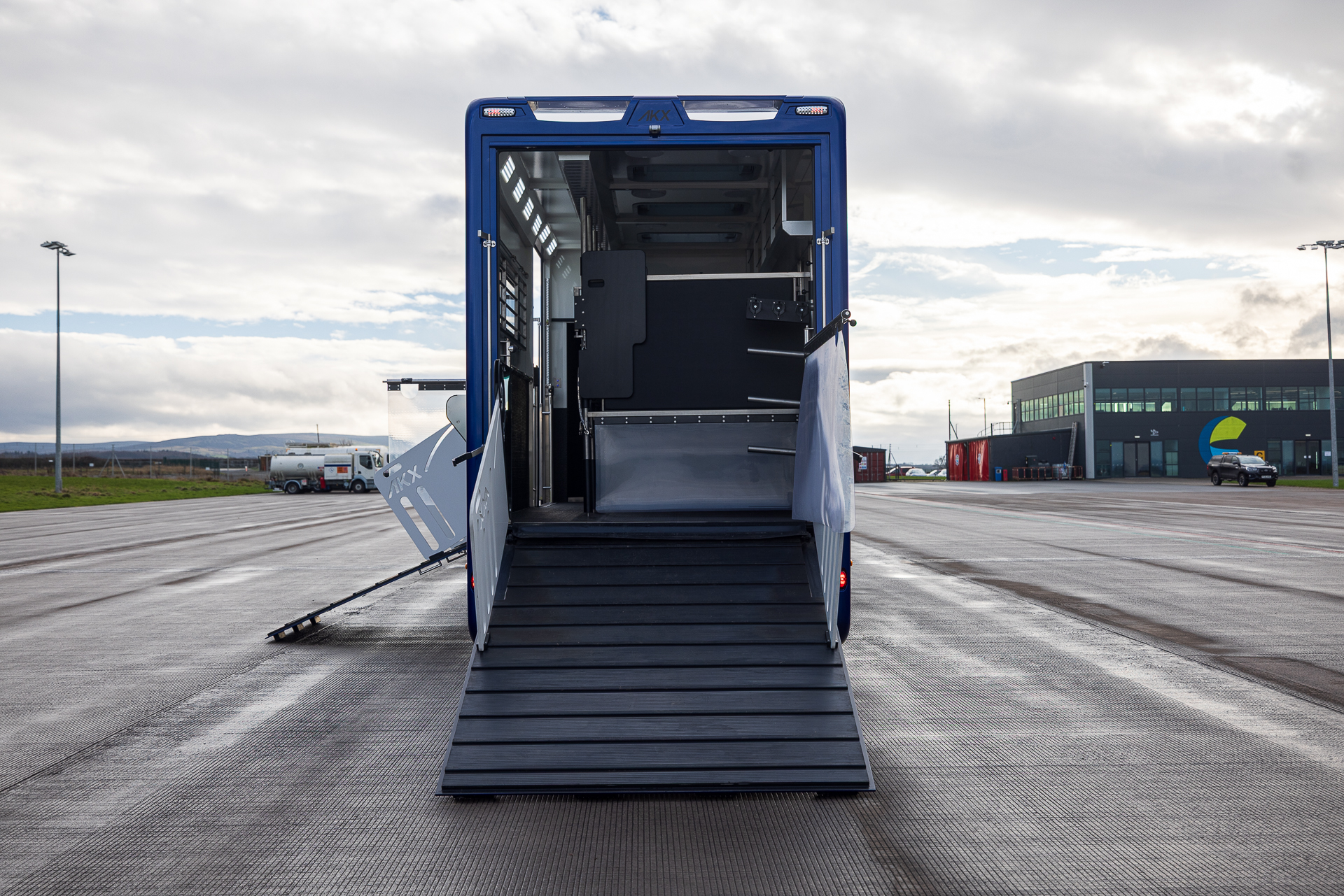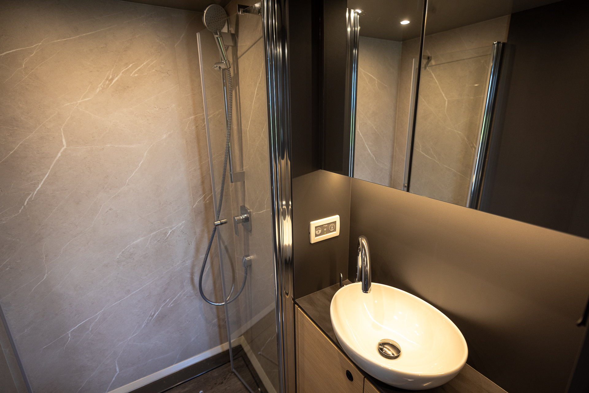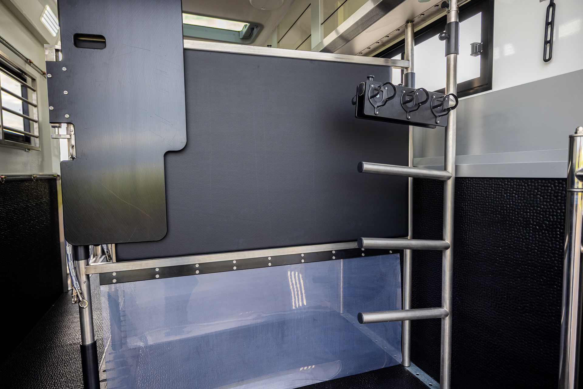 The horse area has been thoughtfully designed with horse welfare as a priority. It features high-quality rubber flooring, skylights for natural light, temperature monitoring, cooling fans and an integrated surveillance camera. Adjustable partitions allow for flexible stabling, while both side and rear loading ramps ensure easy access. Additional practical storage includes a blanket rack, saddle cupboard and onboard water tank, creating a calm, safe and functional environment for travel.