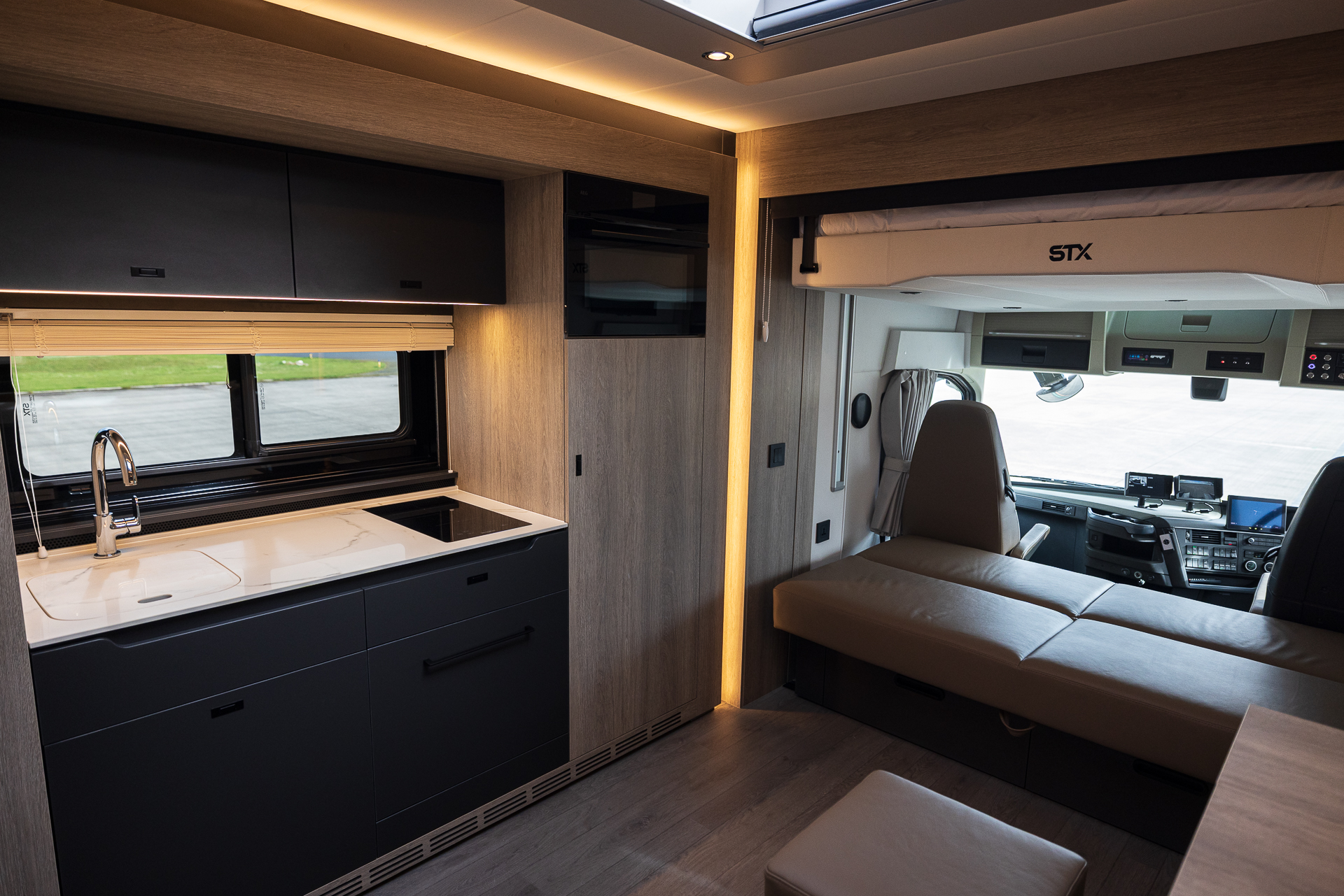 The living accommodation is expansive and luxuriously appointed, benefitting significantly from the dual pop-outs. Upholstered walls and premium leather seating create a refined interior atmosphere, complemented by two televisions, Apple TV, and an exclusive audio system. Climate control is provided by split air-conditioning and heating systems, further enhanced by upgraded boilers and a Kabola KB40 heating system to ensure reliable comfort in all seasons. The fully equipped kitchenette includes a microwave oven, ceramic cooking top, and refrigerator, while the latest USB charging sockets are installed throughout the living area and sleeping quarters for modern convenience.
