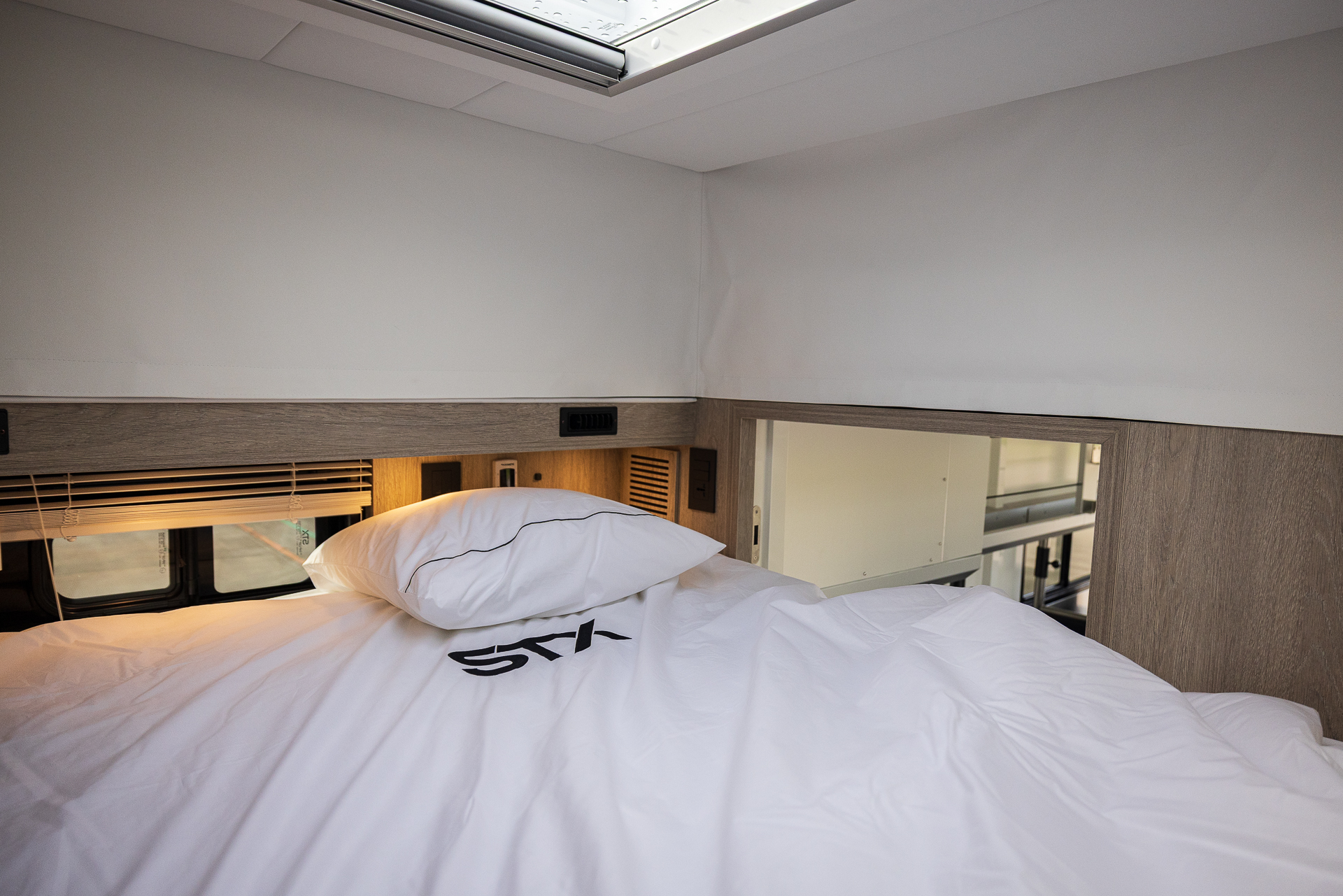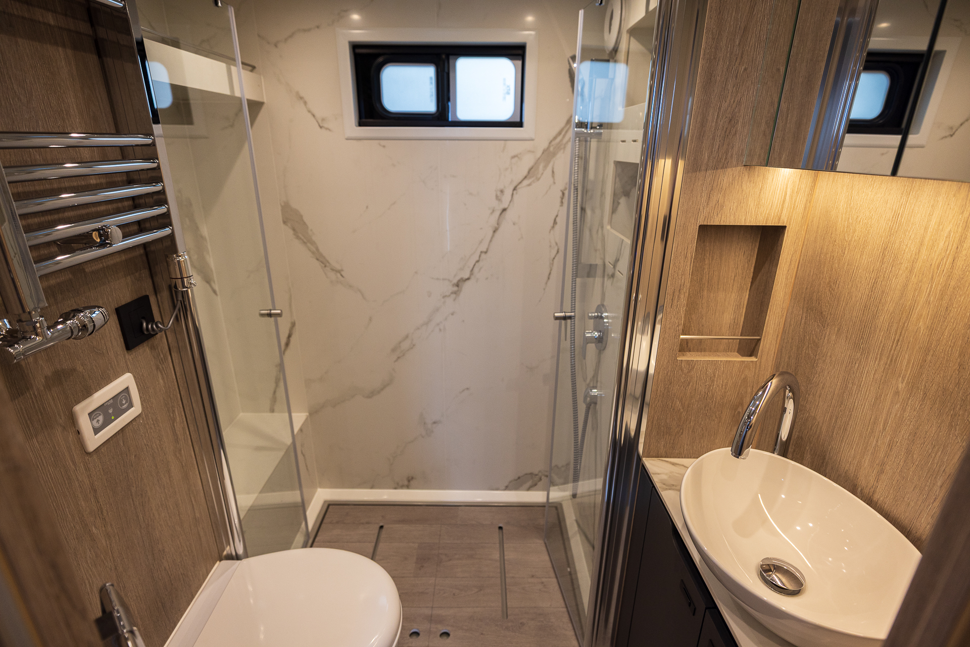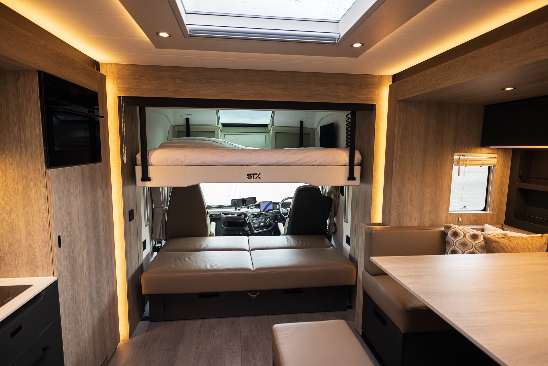 Sleeping arrangements include a dedicated groom’s bedroom positioned above the bathroom, with direct access into the living area, providing privacy without compromising flow. The large bathroom delivers hotel-level practicality, featuring a shower with thermostatic tap, sink with cupboard storage, electrical socket, towel dryer, and toilet. Supporting systems include clean and waste water tanks, 220-volt and 24-volt power supply, a 5 kW generator, exterior lighting with motion sensor, a frost-free water system, 360-degree camera coverage for enhanced manoeuvrability, and aluminium rims that complete the vehicle’s premium specification.