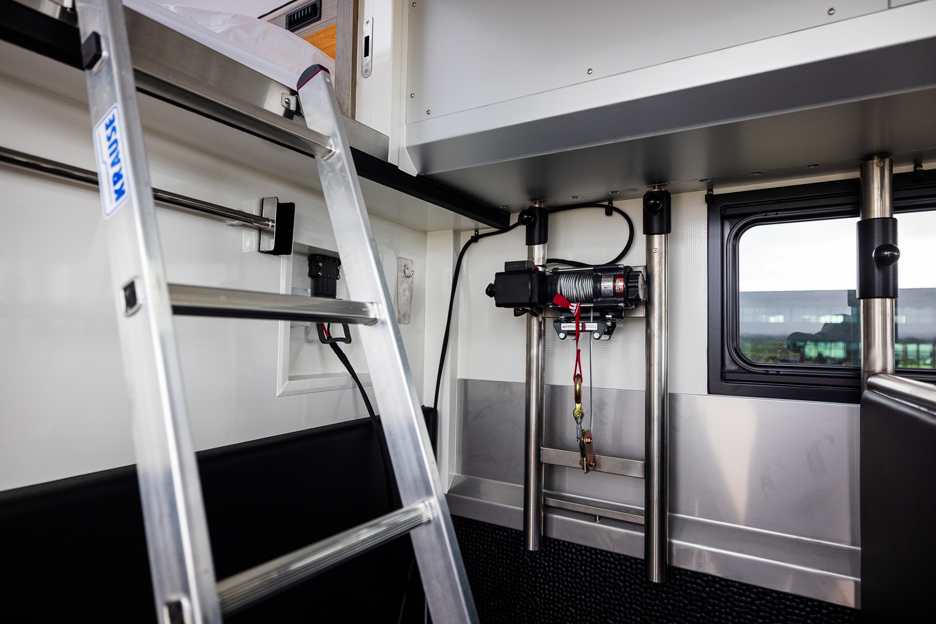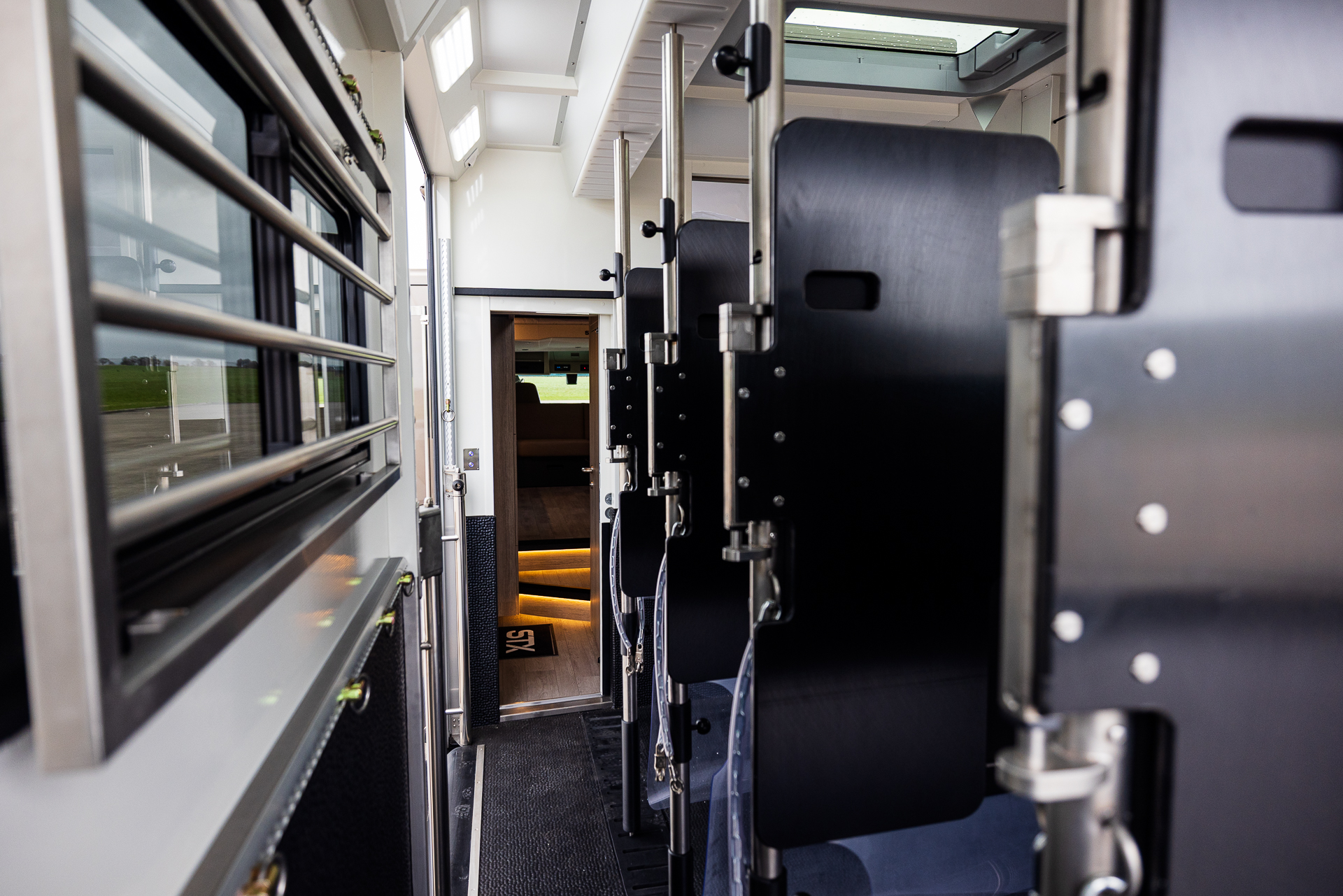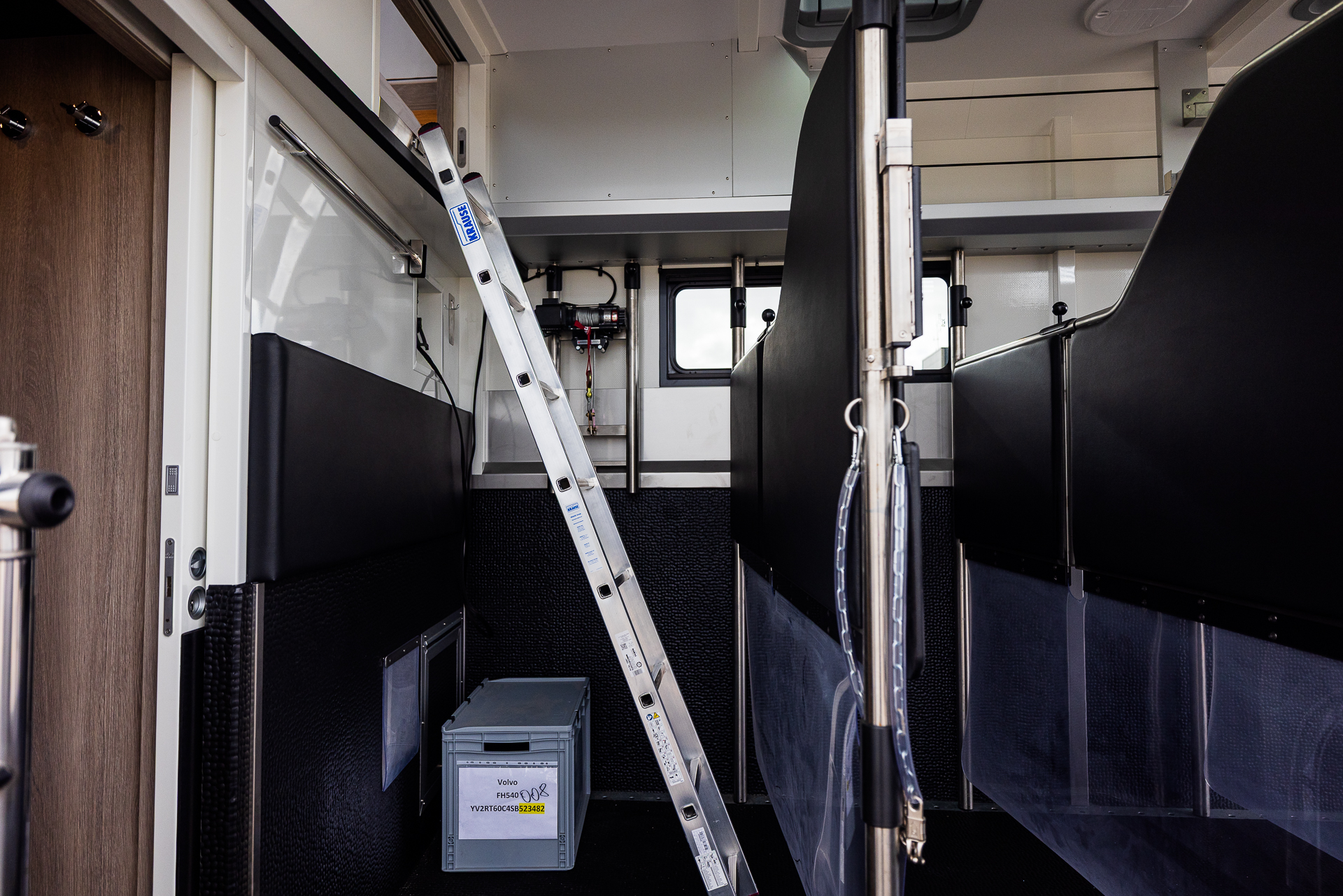 The horse area has been designed with a clear focus on safety, ventilation, and ease of operation. It features durable rubber flooring, skylights, cooling fans, and temperature registration to maintain a stable and comfortable environment during travel. Adjustable partitions allow flexibility for different horses, while a surveillance camera system enables continuous monitoring in transit. Side and rear loading ramps provide safe and efficient access, supported by practical storage solutions including a blanket rack and saddle cupboard. A large external tack box with lift, along with an integrated water tank and hose system, ensures excellent functionality both on the road and at events.